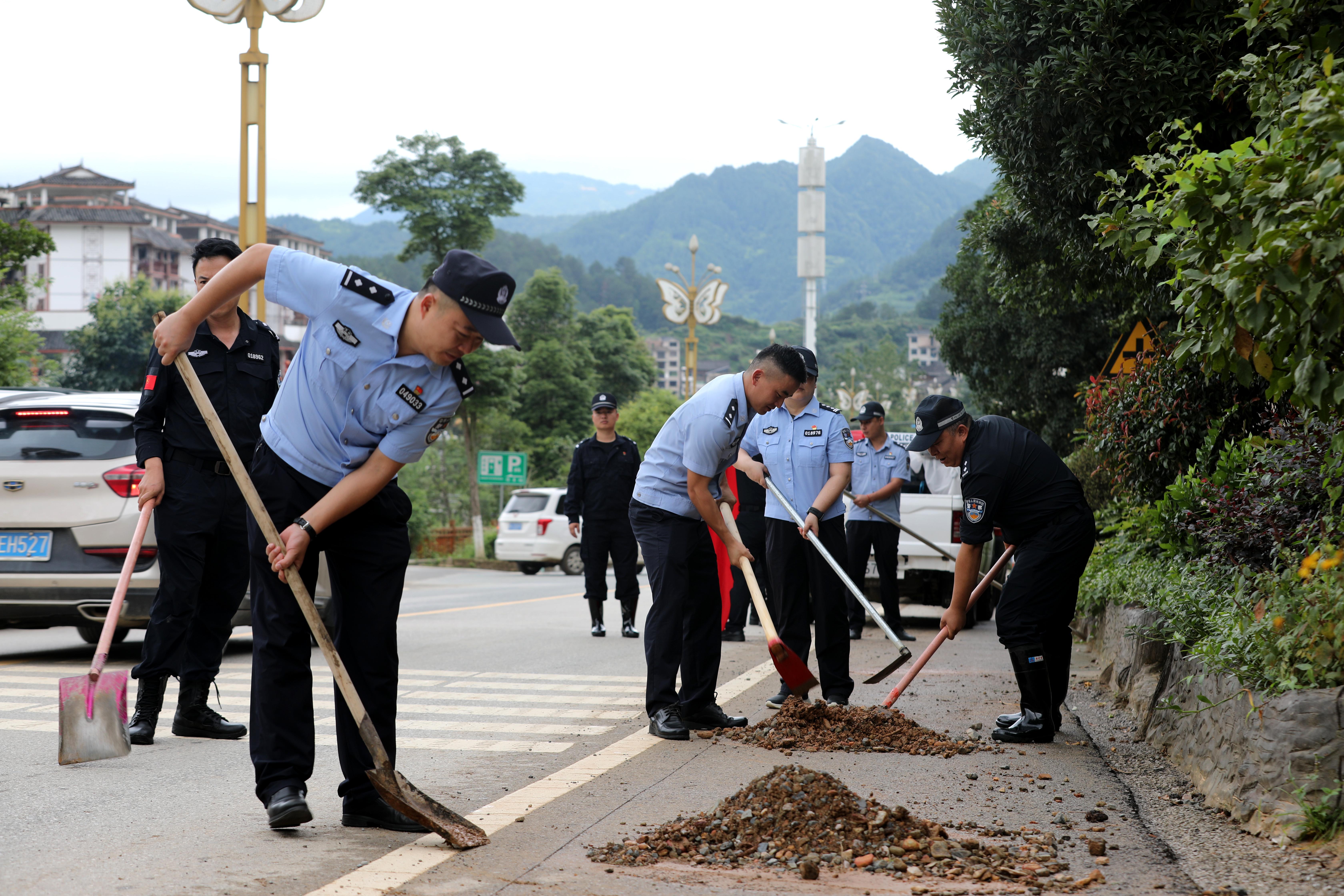 黨旗所指,干警所向。近50名佩戴黨徽的政法干警在丹江鎮(zhèn)、永樂鎮(zhèn)受災(zāi)兩地,他們手持鐵鍬掃帚、高壓水槍全力清淤排障,深入街巷民房,幫助群眾轉(zhuǎn)移物資,恢復(fù)群眾正常生產(chǎn)生活秩序。
