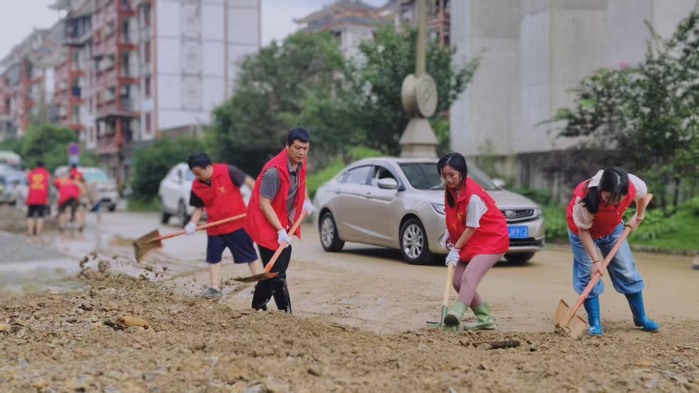 清淤現(xiàn)場,干部職工們手持鐵鍬、掃帚等工具,分工協(xié)作,認真清理道路和公共區(qū)域的淤泥雜物,齊心協(xié)力用實際行動為家園恢復(fù)整潔貢獻力量?! ?/p>