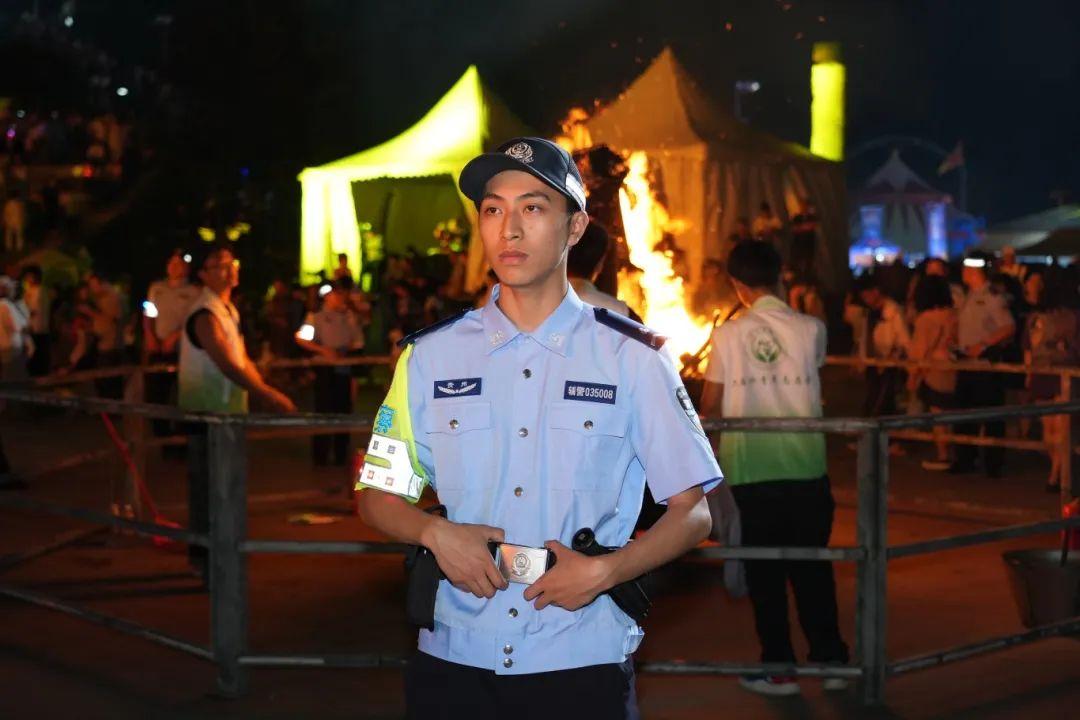 晚上10時,九堆環(huán)形篝火被同時點燃,數(shù)千支火把剎那間將夜空映照得通紅熾烈。人潮隨著彝族達體舞的奔放節(jié)奏熱情涌動、跳躍。此刻,彝族民警王偉旭正帶領(lǐng)巡邏小組在人流中穿梭,目光銳利如鷹,不放過任何一個安全死角。“篝火舞動時,必須保證游客處于火星噴射半徑之外,我們民警組成的這道‘隔離帶’,就是守護生命的安全線!”篝火管控組組長崔恒的話語擲地有聲。