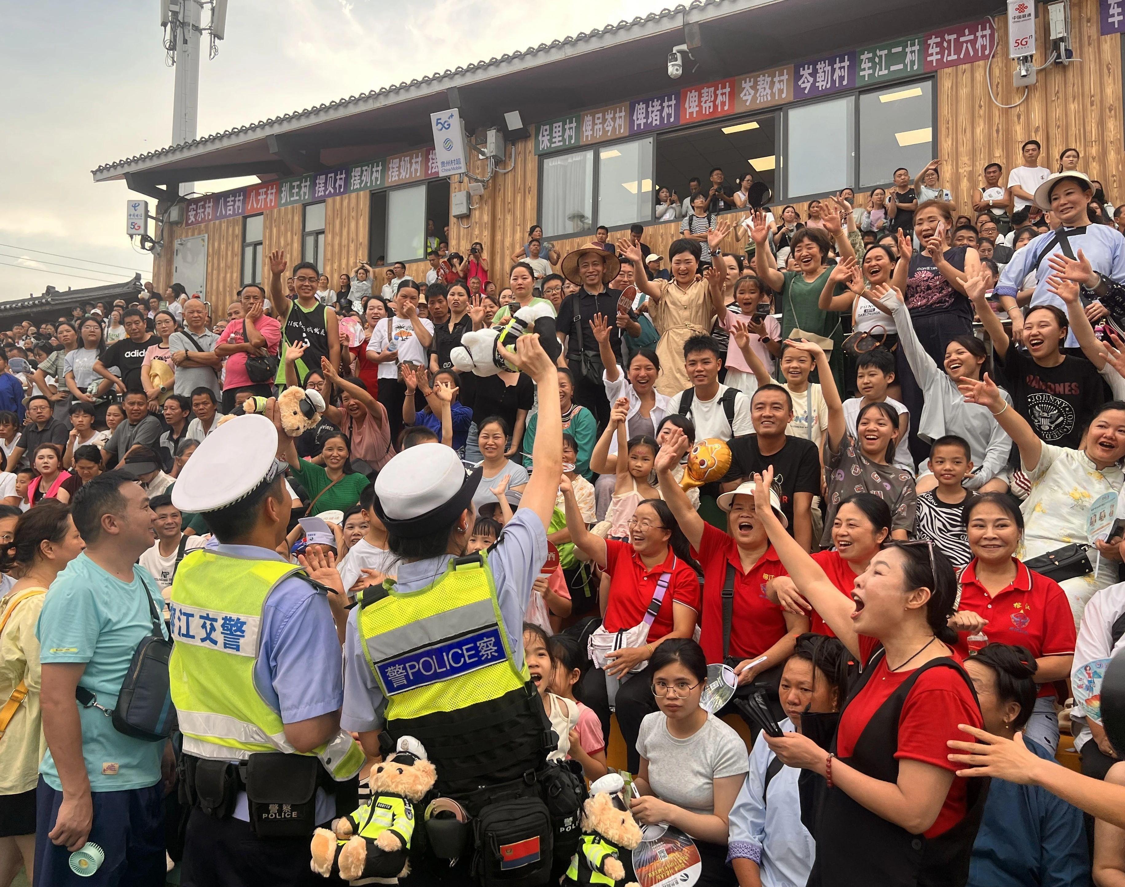賽場內(nèi),球員們奮力拼搶,點(diǎn)燃激情;賽場邊,一抹特別的“熒光綠”“平安藍(lán)”同樣引人注目。貴州公安交管總隊聯(lián)合榕江交警,將交通安全課堂直接搬到了沸騰的觀眾席旁,“答題贏警用小熊”互動區(qū)人頭攢動。