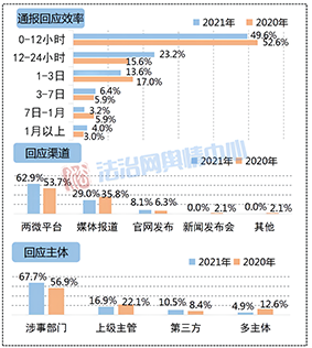 從回應(yīng)渠道來看,官方所依托的發(fā)聲渠道更為集中,有超過六成的輿情事件是借助兩微平臺做出回應(yīng),占比較2020年進一步提升;依靠媒體報道進行回應(yīng)的比重為29%,較上一年下降了近7個百分點;以官網(wǎng)發(fā)布作為回應(yīng)渠道的事件略微增多,占比8.1%。目前來看,大多數(shù)回應(yīng)主體之所以選擇自有渠道主動做出回應(yīng)而非采取第三方轉(zhuǎn)達的方式,是因為一方面集中的內(nèi)容公開明顯提升了回應(yīng)的權(quán)威性,避免被多方轉(zhuǎn)述造成信息誤差從而導致內(nèi)容被公眾曲解的風險,另一方面也可以通過社交平臺直面公眾質(zhì)疑,與輿論達成直接有效的溝通,對接網(wǎng)民“輿論監(jiān)督”的參與期待,以便更好化解輿論爭議。