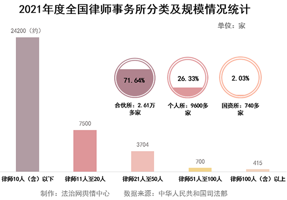 從律所規(guī)模上看,“10人及以下”律所最多,達2.42萬家,“11人至20人”律所次之,達7500家。“100人及以上”的大型律所共有415家。