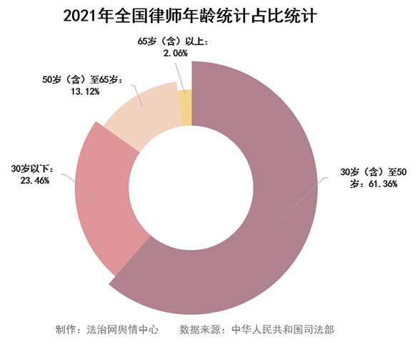 從年齡結構來看,律師行業(yè)處于老中青共存階段。其中,30歲-50歲律師占比最高,達61.36%,30歲以下律師占比達23.46%,律師隊伍年輕化趨勢明顯。