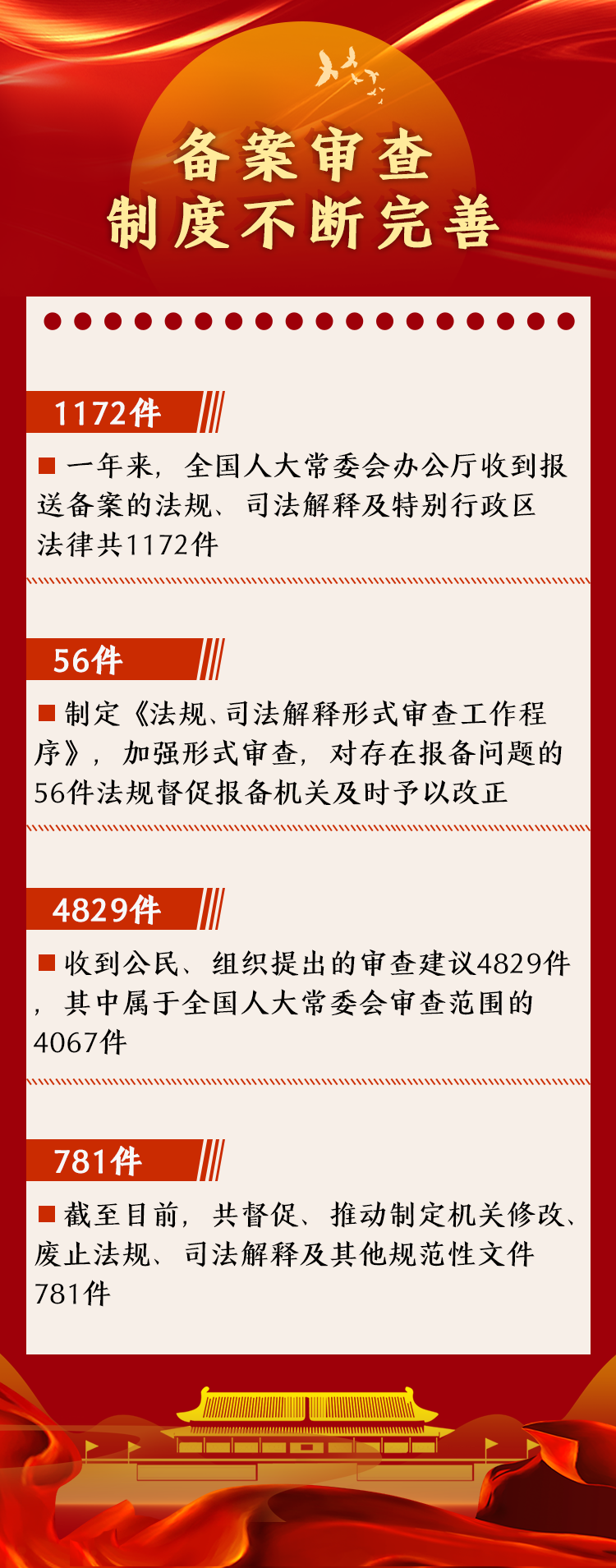 數(shù)字顯示,一年來,全國人大常委會(huì)辦公廳收到報(bào)送備案的法規(guī)、司法解釋及特別行政區(qū)法律共1172件。制定《法規(guī)、司法解釋形式審查工作程序》,加強(qiáng)形式審查,對存在報(bào)備問題的56件法規(guī)督促報(bào)備機(jī)關(guān)及時(shí)予以改正。收到公民、組織提出的審查建議4829件,其中屬于全國人大常委會(huì)審查范圍的4067件。