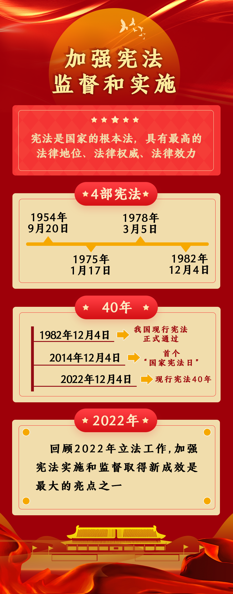 2022年是我國現(xiàn)行憲法公布施行40周年。這40年,也是我國改革開放深入推進(jìn)、經(jīng)濟(jì)社會(huì)迅速發(fā)展、人民生活水平不斷提高的40年?;仡?022年立法工作,加強(qiáng)憲法實(shí)施和監(jiān)督取得新成效是最大的亮點(diǎn)之一。具體包括,不斷健全保證憲法全面實(shí)施的制度體系,通過完備的法律保證憲法實(shí)施,嚴(yán)格落實(shí)合憲性審查制度機(jī)制,深入推進(jìn)合憲性審查工作,更好發(fā)揮憲法在治國理政中的重要作用,維護(hù)憲法權(quán)威和尊嚴(yán)。