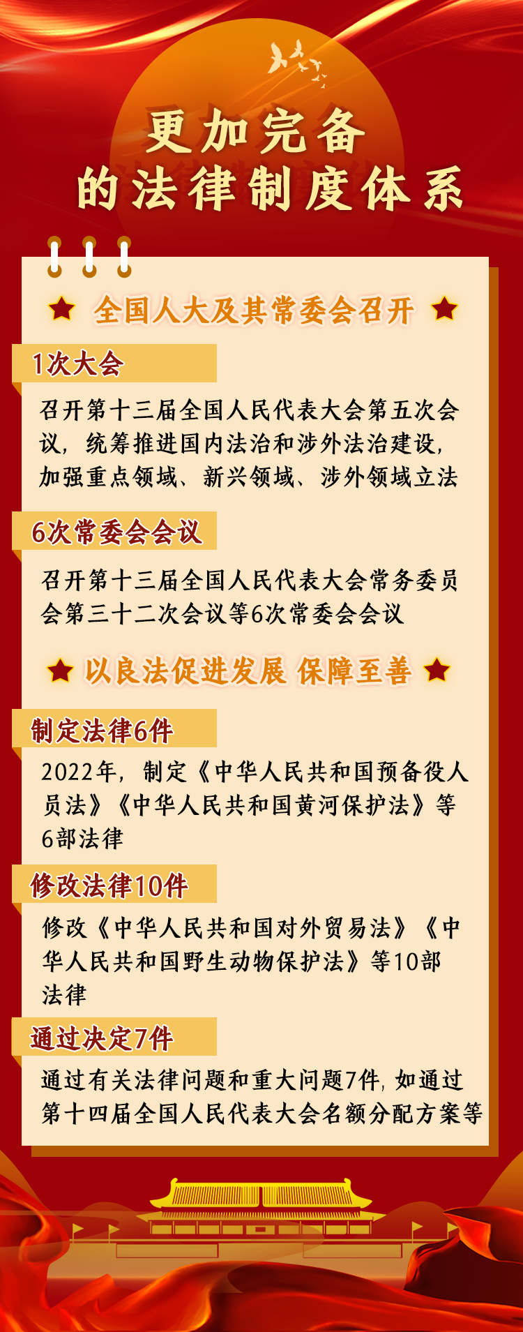 據(jù)統(tǒng)計(jì),2022年,全國人大及其常委會(huì)召開了1次大會(huì)和6次常委會(huì)會(huì)議,統(tǒng)籌推進(jìn)國內(nèi)法治和涉外法治建設(shè),加強(qiáng)重點(diǎn)領(lǐng)域、新興領(lǐng)域、涉外領(lǐng)域立法,制定法律6件,修改法律10件次,作出法律解釋1件,通過有關(guān)法律問題和重大問題決定7件,法律制度體系更加完備。