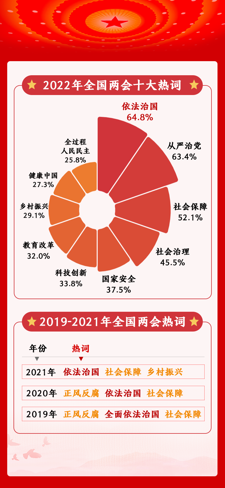 2022年,人民網(wǎng)開展的全國(guó)兩會(huì)調(diào)查評(píng)選出十大熱詞。據(jù)調(diào)查結(jié)果顯示,“依法治國(guó)”“從嚴(yán)治黨”“社會(huì)保障”三大熱詞關(guān)注度位居前三位。其中,“依法治國(guó)”最受關(guān)注,選擇該熱詞的網(wǎng)民占比64.8%。