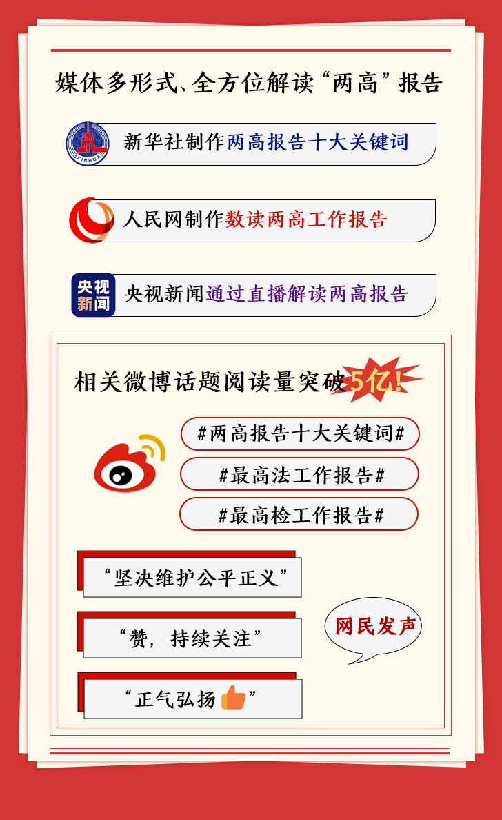 新華社制作長(zhǎng)圖整理“兩高”報(bào)告亮點(diǎn)內(nèi)容;人民網(wǎng)用數(shù)據(jù)解讀“兩高”報(bào)告;“@央視新聞”則通過(guò)直播幫助公眾快速了解報(bào)告詮釋的法治精神。“兩高”報(bào)告相關(guān)話題獲得網(wǎng)民廣泛關(guān)注,截至3月8日8時(shí),“#兩高報(bào)告十大關(guān)鍵詞#”等微博話題閱讀量累計(jì)超5億。