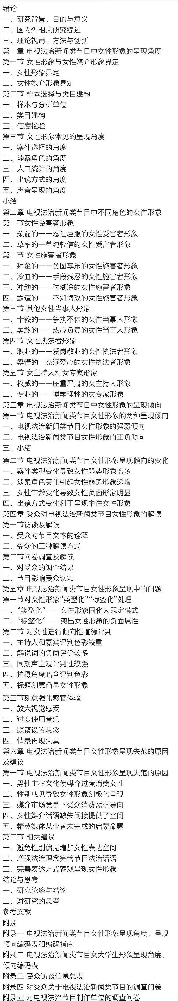 由此,本書對(duì)電視法治新聞?lì)惞?jié)目對(duì)女性形象的呈現(xiàn)角度、呈現(xiàn)類型、符號(hào)運(yùn)用等方面加以研究,回答了電視法治新聞?lì)惞?jié)目對(duì)女性如何呈現(xiàn)、呈現(xiàn)的角度、呈現(xiàn)的傾向以及呈現(xiàn)的方式,指出其中存在的問題并探討成因。