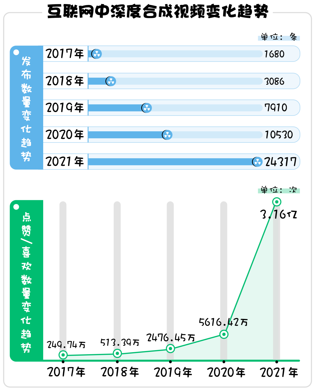 上一次人們感嘆人工智能的強大,還要追溯到2016年,阿爾法圍棋(AlphaGo)成為了第一個擊敗圍棋世界冠軍的人工智能機器人,深度學習的威力開始顯現(xiàn)。在此后的幾年,深度合成技術(shù)被廣泛應(yīng)用于各個領(lǐng)域。以互聯(lián)網(wǎng)中深度合成視頻為例,根據(jù)清華大學人工智能研究院聯(lián)合多家單位發(fā)布的《深度合成十大趨勢報告(2022)》顯示,近幾年,互聯(lián)網(wǎng)中深度合成視頻的發(fā)布與傳播數(shù)量呈現(xiàn)高速增長的態(tài)勢。