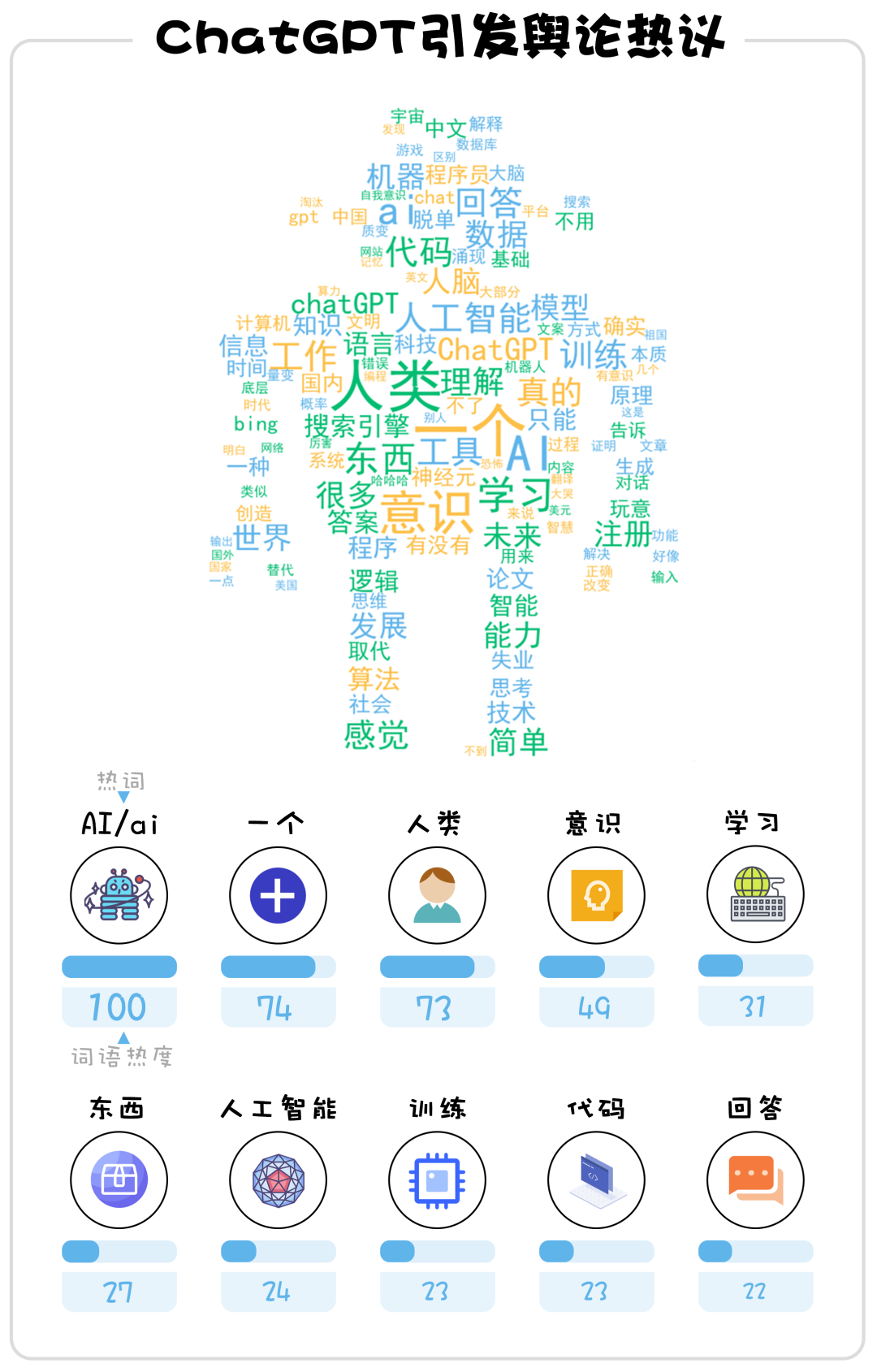 (制作:法治網(wǎng)輿情中心 數(shù)據(jù)來源:以“ChatGPT”“改變”“崗位”為關(guān)鍵詞,在嗶哩嗶哩搜索熱度較高的視頻,選取近6000條彈幕及一級評論,對所選數(shù)據(jù)進行NLP分析,將出現(xiàn)次數(shù)最多的詞語規(guī)定為100,以該詞語為基準對其他熱詞進行等尺度放縮)
