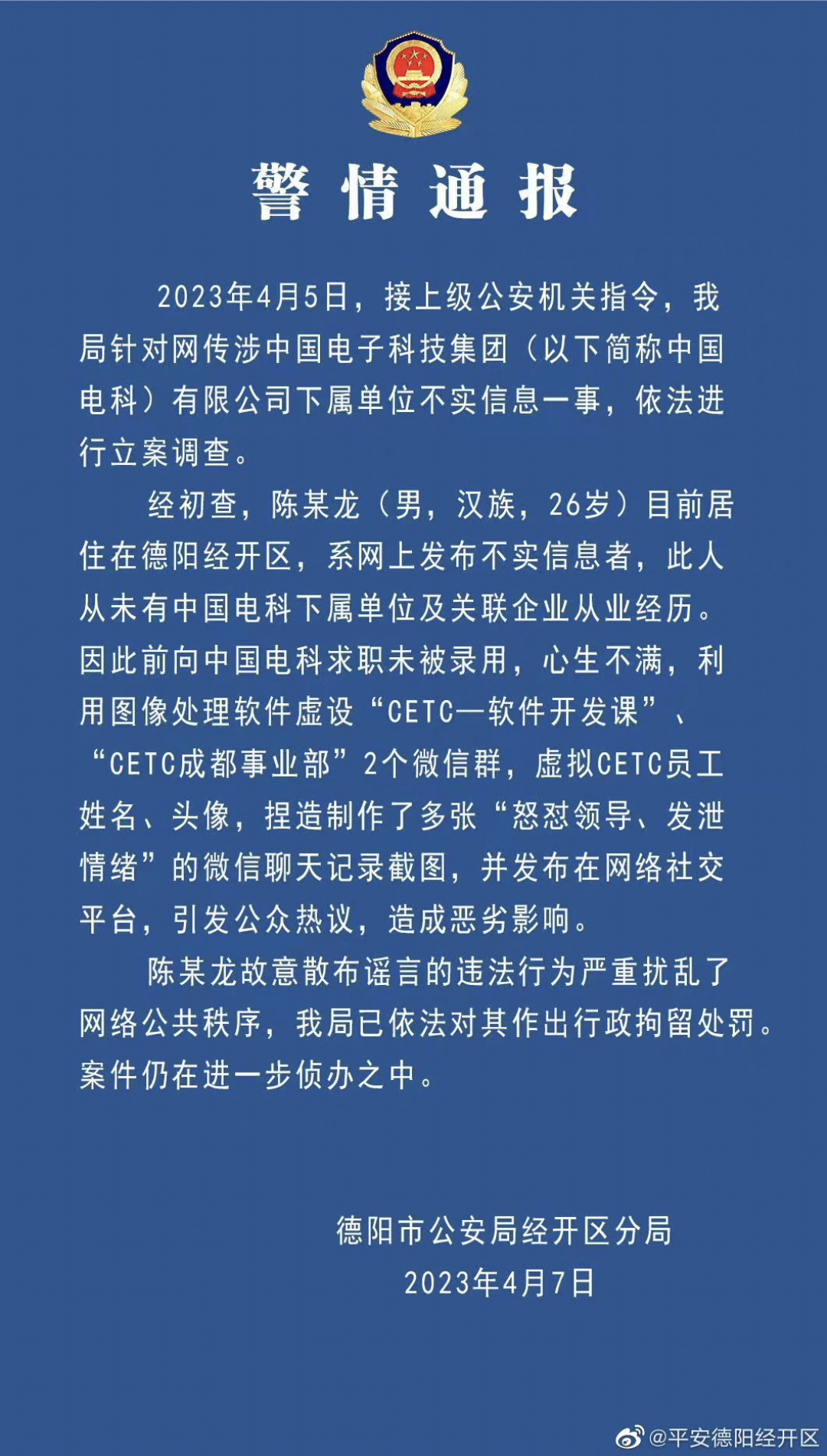 4月7日,大皖新聞報(bào)道稱,網(wǎng)傳加班事件當(dāng)事人陳志龍為四川省德陽市經(jīng)開區(qū)某科技公司員工,德陽市人社局辦公室也回應(yīng)稱“正在進(jìn)行調(diào)查”。4月7日晚間,四川省德陽市公安局經(jīng)開區(qū)分局通過官方微博發(fā)布警方通報(bào)稱,陳某龍從未有中國電科下屬單位及關(guān)聯(lián)企業(yè)從業(yè)經(jīng)歷,其因此前向中國電科求職未被錄用,心生不滿,利用圖像處理軟件虛設(shè)“CETC—軟件開發(fā)課”“CETC成都事業(yè)部”2個(gè)微信群,虛擬CETC員工姓名、頭像,捏造制作了多張“怒懟領(lǐng)導(dǎo)、發(fā)泄情緒”的微信聊天記錄截圖,并發(fā)布在網(wǎng)絡(luò)社交平臺(tái),造成惡劣影響。目前陳某龍已被警方行政拘留。4月8日,微博平臺(tái)官方表示,已清理此事件中散布不實(shí)信息、惡意攻擊國企體制的違規(guī)內(nèi)容5792條,并對(duì)“@老c隊(duì)長(zhǎng)”等9個(gè)違規(guī)“自媒體”賬號(hào)及253個(gè)違規(guī)用戶予以禁言處置。