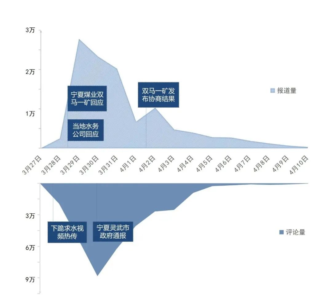 3月29日,部分中央主流媒體發(fā)聲表態(tài):“@中國(guó)新聞網(wǎng)”稱“‘缺水’的輿論場(chǎng)需要真相甘霖”;央廣網(wǎng)推出文章《萬(wàn)畝治沙林被煤礦“斷水”?供水和調(diào)查必須馬上到位》,指出當(dāng)?shù)乇仨毐M快用客觀公正的調(diào)查還原真相,給林場(chǎng)主一個(gè)交代,給萬(wàn)畝林場(chǎng)一個(gè)交代,也給公眾一個(gè)交代。輿論場(chǎng)還曝光一份判決書,顯示寧夏回族自治區(qū)銀川市中院曾作出判決,明確該煤礦占用林地,要求賠償孫國(guó)友727.54萬(wàn)元。另?yè)?jù)九派新聞報(bào)道,當(dāng)?shù)厮畡?wù)公司負(fù)責(zé)人稱,礦場(chǎng)污水處理達(dá)標(biāo),但是水的鹽分過(guò)高澆不了樹(shù)。煤礦一方稱,污水處理設(shè)備容量比較小,每天只能處理兩千立方,且資金成本太大,不想加大投入。靈武市政府相關(guān)人員向媒體表示,正在針對(duì)此事協(xié)調(diào)處理。當(dāng)日,“#萬(wàn)畝樹(shù)木被煤礦斷水面臨枯死#”“#水務(wù)公司回應(yīng)萬(wàn)畝林場(chǎng)主跪地求供水#”等相關(guān)微博話題沖上熱搜榜前列,輿情熱度達(dá)到峰值。部分網(wǎng)民表示,經(jīng)歷了沙塵暴,才能真正明白造林治沙的好處和難處,“不能讓好人流汗流淚又流血”。微博大V“@胡錫進(jìn)”也呼吁,希望不用下跪崩潰引起巨大輿情也能正常解決。