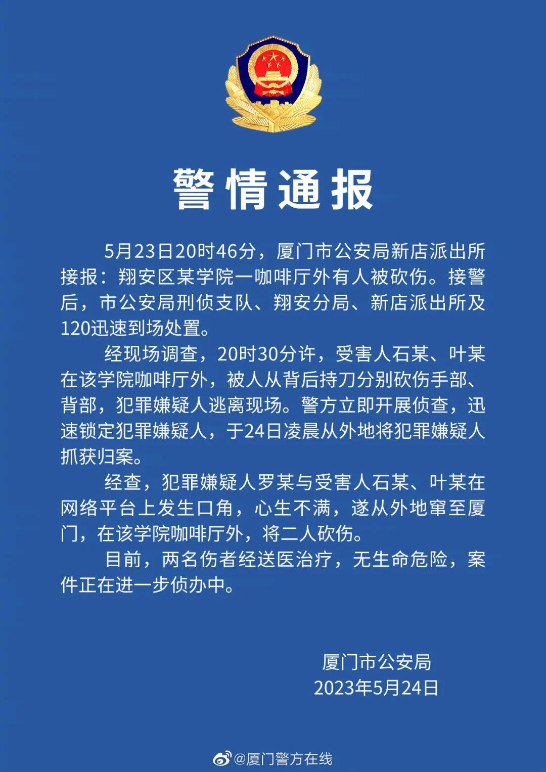 5月24日0時(shí)許,頂端新聞?dòng)浾呗?lián)系到廈門(mén)市翔安區(qū)新店派出所及翔安區(qū)公安局,相關(guān)工作人員均表示,警方已經(jīng)介入調(diào)查,后續(xù)會(huì)發(fā)布通報(bào)。當(dāng)日12時(shí)許,“@廈門(mén)警方在線”發(fā)布警情通報(bào)稱(chēng),5月23日20時(shí)30分許,受害人石某、葉某在某學(xué)院咖啡廳外,被人從背后持刀分別砍傷手部、背部。20時(shí)46分,廈門(mén)市公安局新店派出所接報(bào)立即開(kāi)展偵查,于24日凌晨從外地將犯罪嫌疑人抓獲歸案。經(jīng)查,犯罪嫌疑人羅某與受害人石某、葉某在網(wǎng)絡(luò)平臺(tái)上發(fā)生口角,心生不滿,遂從外地竄至廈門(mén)實(shí)施作案。目前,兩名傷者經(jīng)送醫(yī)治療,無(wú)生命危險(xiǎn),案件正在進(jìn)一步偵辦中。