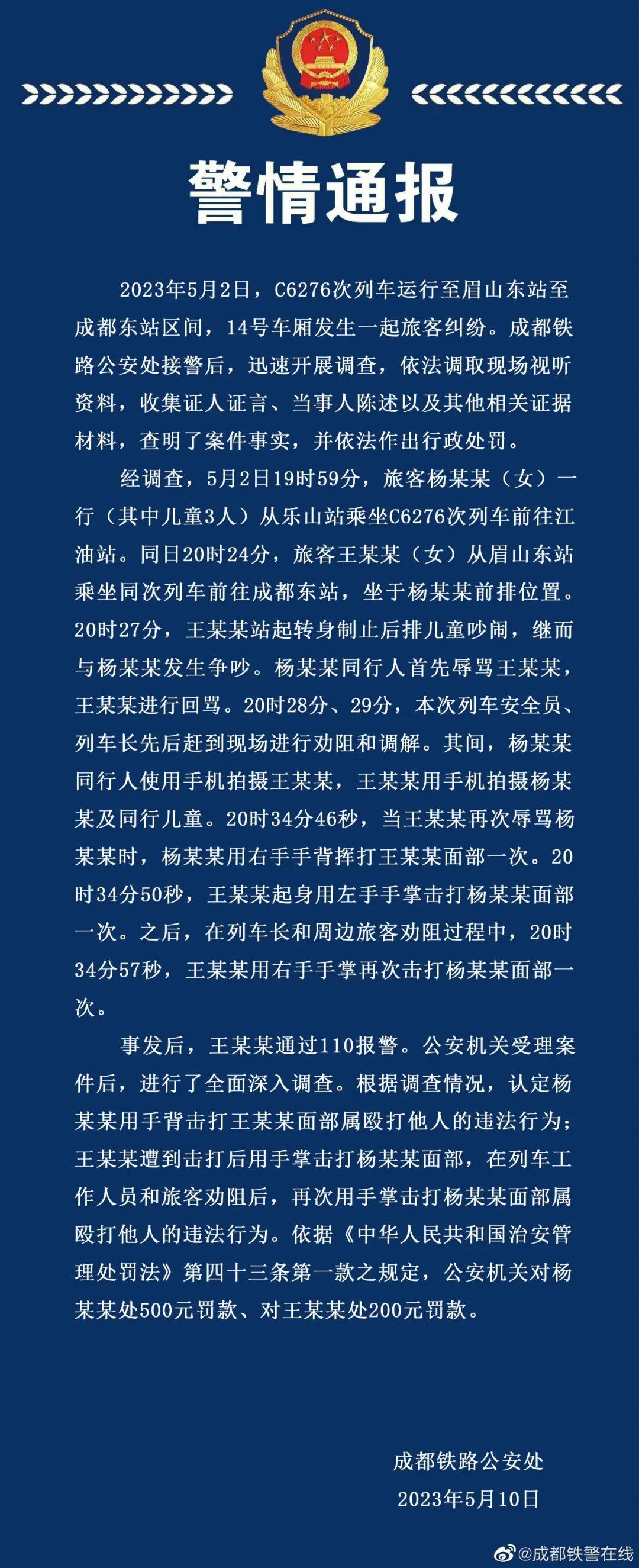 面對網(wǎng)絡(luò)質(zhì)疑,5月10日,成都鐵路公安處官方微博“@成都鐵警在線”發(fā)布警情通報稱,根據(jù)調(diào)查情況,認(rèn)定楊某某用手背擊打王某某面部屬毆打他人的違法行為;王某某遭到擊打后用手掌擊打楊某某面部,在列車工作人員和旅客勸阻后,再次用手掌擊打楊某某面部屬毆打他人的違法行為。警方據(jù)此認(rèn)為雙方均違反治安管理處罰法,并處以不同金額的罰款。隨后,四川廣播電視臺“@四川觀察”、封面新聞公布現(xiàn)場視頻,涉及列車車廂監(jiān)控、列車長巡檢記錄儀、當(dāng)事雙方手機(jī)所拍視頻等多個角度,直觀地呈現(xiàn)雙方發(fā)生爭執(zhí)繼而爆發(fā)肢體沖突的過程。網(wǎng)絡(luò)討論熱度再次攀升,微博上形成“#高鐵掌摑事件雙方曾多次對罵#”“#高鐵被打女子2次打人被認(rèn)定違法#”“#王某某被打后兩次掌摑楊某某#”等多個話題,不少網(wǎng)民一改之前支持王某某的立場。但部分網(wǎng)民仍從情感角度出發(fā),質(zhì)疑官方對視頻進(jìn)行二次剪輯,認(rèn)為警方苛求被打者還擊的間隔時間有失公平。