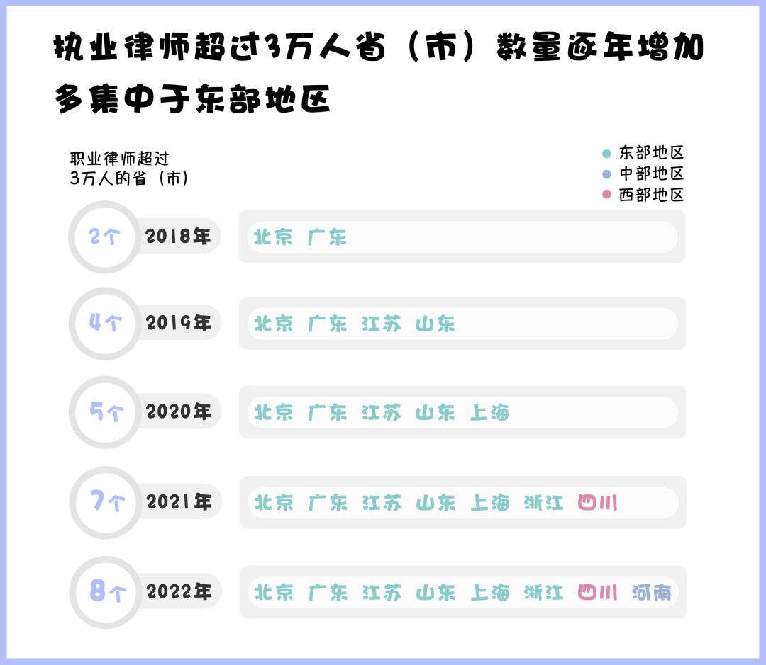 從司法部發(fā)布的數(shù)據(jù)來看,近五年來,律師人數(shù)超過3萬人的?。ㄊ校?shù)量持續(xù)上漲,截至2022年底,共有8個?。ㄊ校┑穆蓭熑藬?shù)超過3萬,其中除河南、四川外,其余省(市)均分布在東部地區(qū)。