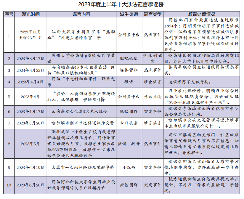 近年來,網(wǎng)絡(luò)謠言成為擾亂輿論秩序的一大頑疾,政法機關(guān)更是頻頻牽涉其中,亟需有效打擊。本研究匯總2023年上半年共242起網(wǎng)絡(luò)涉法謠言,從中總結(jié)出2023年上半年涉法網(wǎng)絡(luò)謠言特征,并圍繞謠言治理工作提出建議,供有關(guān)部門參考。
