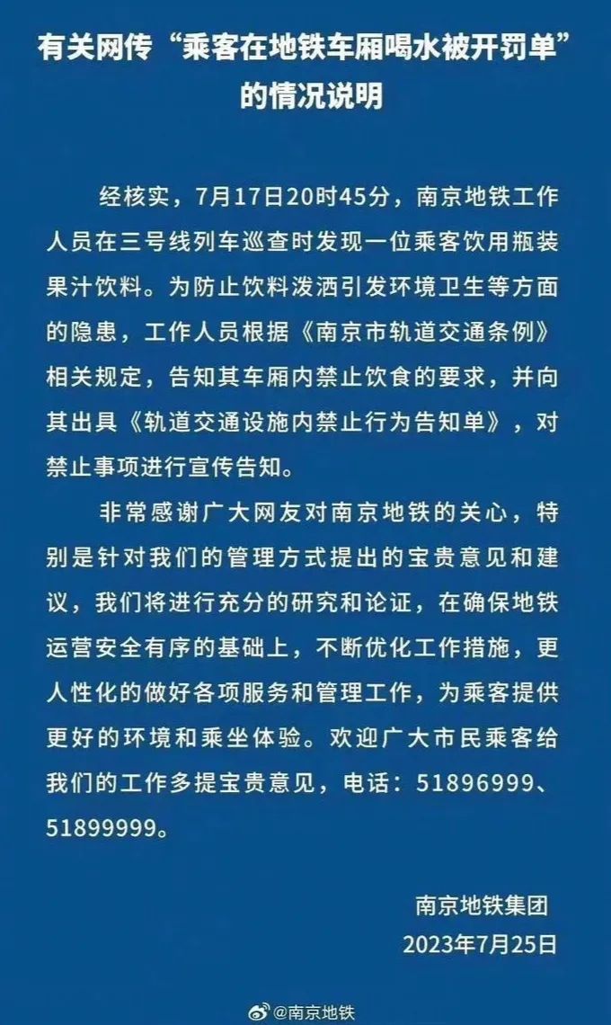 當(dāng)日18時(shí)許,南京地鐵在其官方微博發(fā)布《有關(guān)網(wǎng)傳“乘客在地鐵車廂喝水被開(kāi)罰單”的情況說(shuō)明》,文中稱,工作人員在列車巡查時(shí)發(fā)現(xiàn)一位乘客飲用瓶裝果汁飲料,為防止飲料潑灑引發(fā)環(huán)境衛(wèi)生等方面的隱患,工作人員根據(jù)相關(guān)規(guī)定,向其出具《軌道交通設(shè)施內(nèi)禁止行為告知單》,對(duì)禁止事項(xiàng)進(jìn)行宣傳告知。南京地鐵還表示,將“不斷優(yōu)化工作措施,更人性化地做好各項(xiàng)服務(wù)和管理工作”。