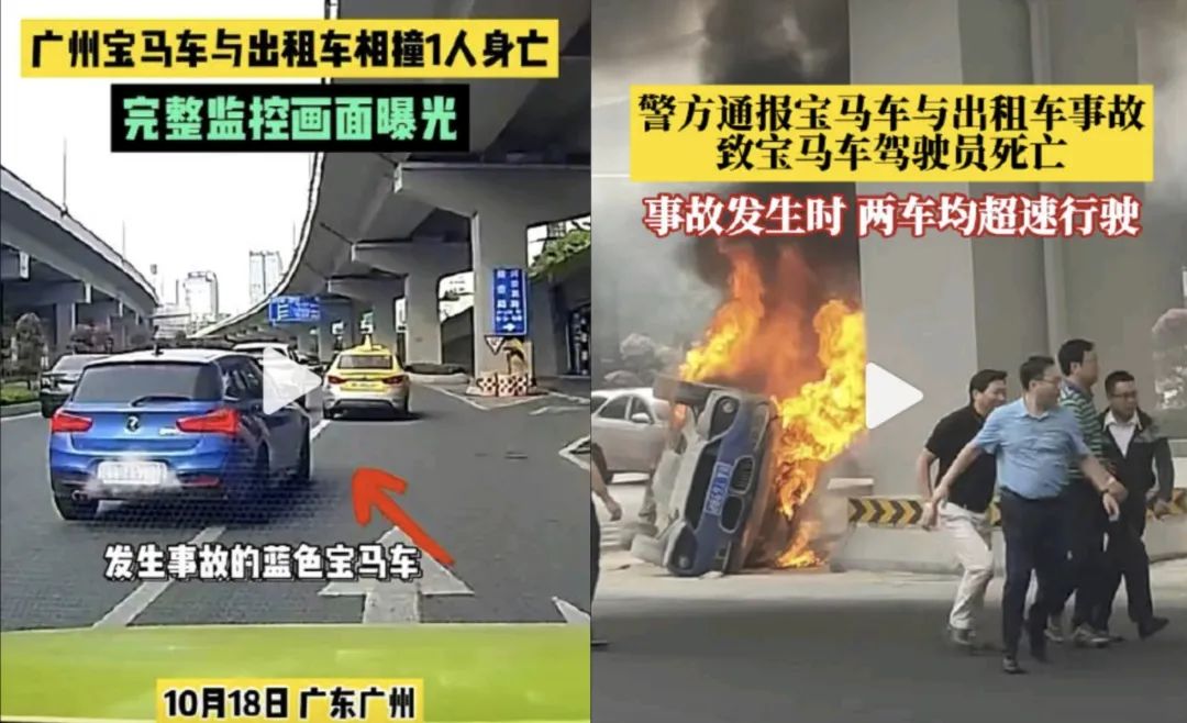 10月18日早高峰,廣州市廣園中路發(fā)生一起交通事故。事發(fā)一小時后,“@廣州交警”發(fā)布情況通報稱系兩輛小汽車碰撞導致其中一輛小汽車側翻后自燃的交通事故。之后,多段與事故相關的行車記錄儀視頻在網(wǎng)絡快速傳播。視頻中,藍色寶馬車在密集車流中連續(xù)加速變道并靠近出租車,之后強行變道以致事故發(fā)生。由于現(xiàn)場視頻沖擊力較強,引發(fā)網(wǎng)民熱議,部分網(wǎng)民猜測寶馬車和出租車在相撞前存在“斗氣”行為。還有網(wǎng)民根據(jù)視頻指出兩車速度過快,疑似超速行駛。