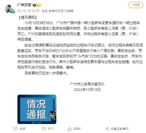 10月19日,輿情熱度呈現(xiàn)升溫態(tài)勢,當日共有5個話題登上微博熱搜榜前列,話題“寶馬與出租車碰撞側翻起火司機身亡”更是登上熱搜榜首位,閱讀量超過1億人次?!稙t湘晨報》、紅星新聞等媒體采訪目擊者,試圖還原事故全貌。《華商報》援引現(xiàn)場警方反饋稱,寶馬車駕駛員因無法離開駕駛室不幸身亡。當日16時許,“@廣州交警”發(fā)布詳細通報稱,經(jīng)多方查證,事故發(fā)生前,兩車由東向西各自行駛,暫未發(fā)現(xiàn)存在開“斗氣車”行為的證據(jù);事故發(fā)生時,兩車均存在超速行駛的違法行為,其中小型轎車連續(xù)變更車道與出租車發(fā)生碰撞;事故致寶馬車駕駛人馮某死亡。警方通報發(fā)布后獲得網(wǎng)民肯定,多數(shù)網(wǎng)民認為通報說清楚了事故的來龍去脈,部分網(wǎng)民呼吁警方盡快明確事故中的責任劃分。