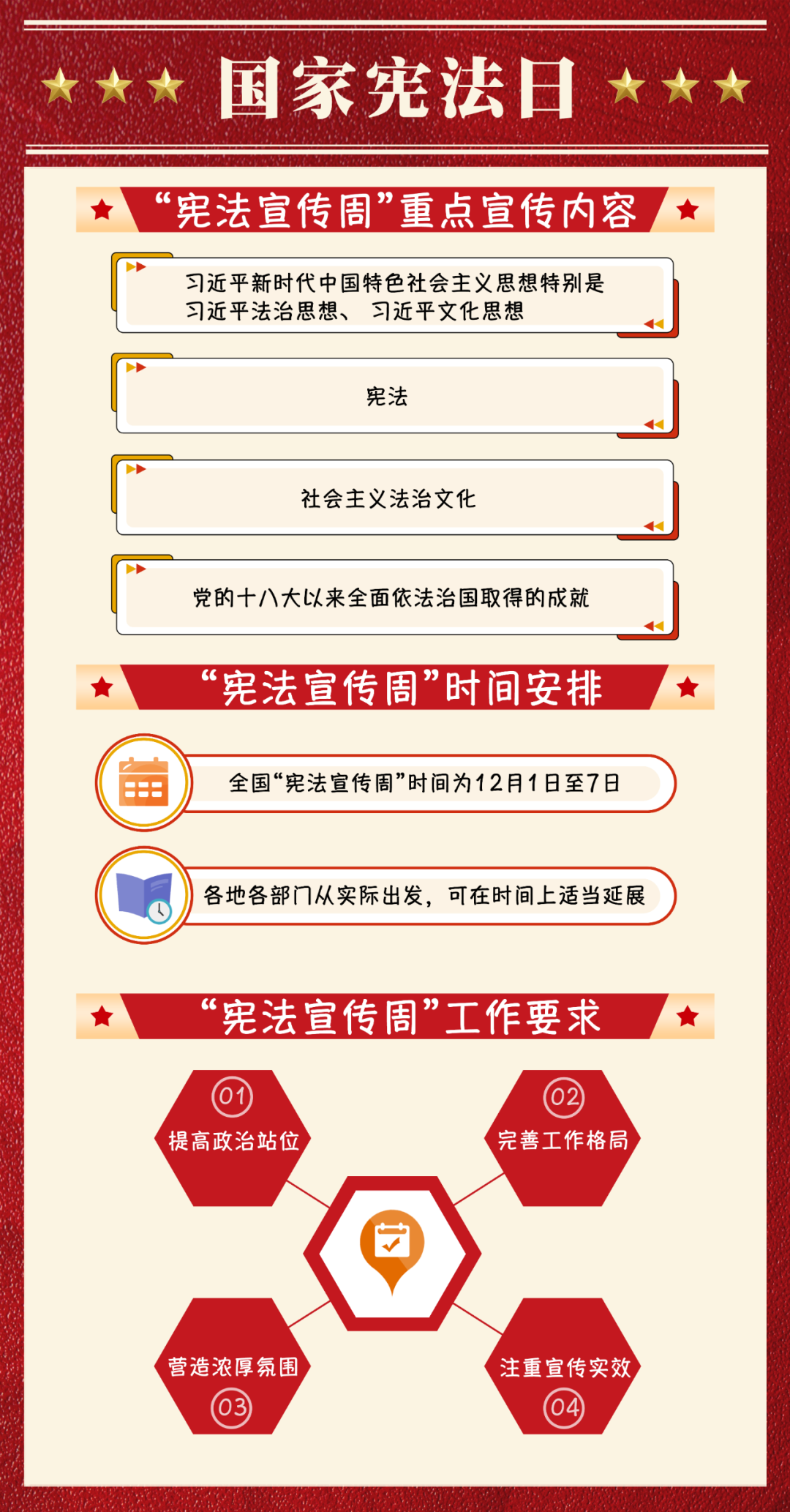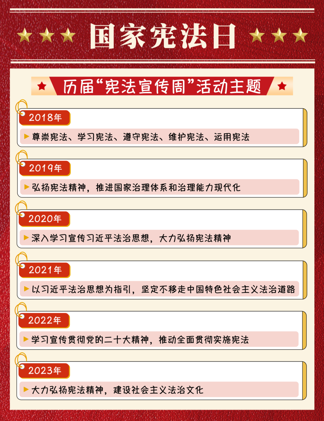 2023年12月4日是第十個國家憲法日,12月1日至7日是第六個“憲法宣傳周”,主題是“大力弘揚憲法精神,建設社會主義法治文化”。