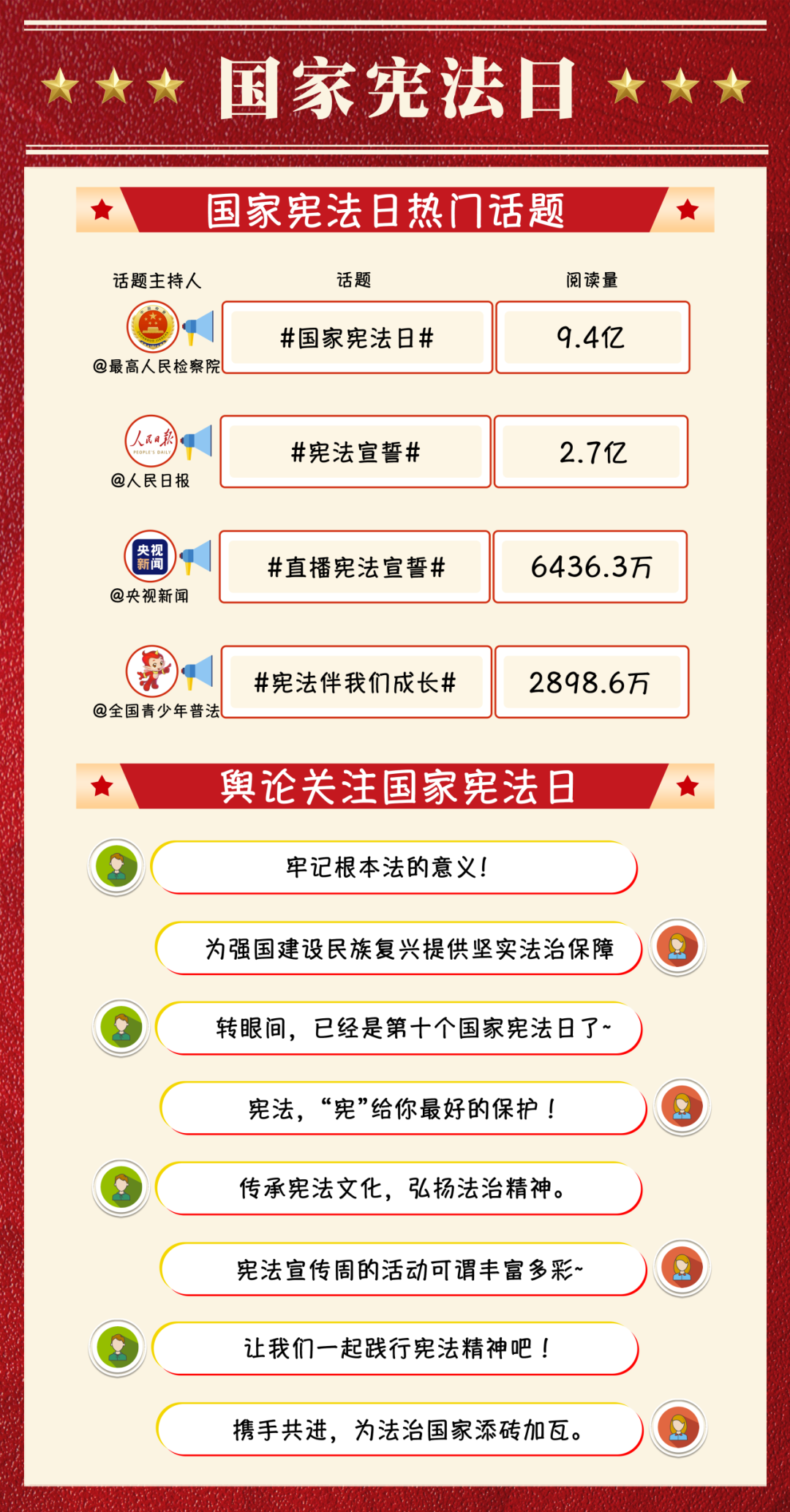 在第十個國家憲法日到來之際,多方積極宣傳相關信息,形成了多渠道、深層次的傳播格局,為弘揚憲法精神創(chuàng)造良好輿論氛圍?!?國家憲法日#”“#憲法宣誓#”等微博熱門話題閱讀量分別達到9.4億余次、2.7億余次?!稗D眼間,已經(jīng)是第十個國家憲法日了”“傳承憲法文化,弘揚法治精神”“攜手共進,為法治國家添磚加瓦”等網(wǎng)民留言高居評論區(qū)前排。