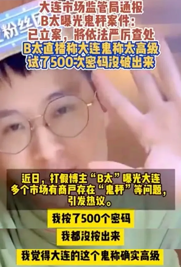 11月9日,“B太”發(fā)布實測海鮮加工餐廳的視頻,稱其到訪的3家海鮮加工商家均疑似在秤上做了手腳?!癇太”嘗試破解商家使用的“鬼秤”密碼時,被商家推搡,還遭威脅“把眼鏡給你砸了”;其撥打市場監(jiān)管局電話后,等待一個半小時仍無人到場,直到“B太”開啟直播,工作人員才姍姍來遲?!癇太”出示相關(guān)視頻證據(jù),經(jīng)檢查該商家的電子秤雖然有強檢合格證,但沒有鉛封。而當(dāng)“鬼秤”被帶到市場監(jiān)管局時,專業(yè)檢測人員只對“問題電子秤”進(jìn)行簡單檢測后就宣布該秤“無問題”。當(dāng)“B太”提出對電子秤進(jìn)行密碼破譯時,檢測人員表示“我也跟著學(xué)習(xí)學(xué)習(xí)”,但“B太”嘗試了500多個密碼都未破解成功。次日,該電子秤被送往無錫檢測。“B太”在微博和抖音平臺發(fā)布相關(guān)視頻,播放量迅速破億次,多數(shù)網(wǎng)民指責(zé)店家有恃無恐,質(zhì)疑市場監(jiān)管部門消極怠工;部分計劃去大連旅游的網(wǎng)民還表示,因擔(dān)心被“坑”將臨時改變目的地。