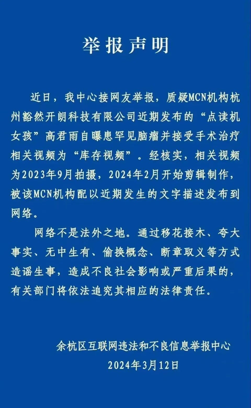 3月12日,涉事MCN機(jī)構(gòu)杭州豁然開朗科技有限公司發(fā)布致歉聲明稱,文案的時(shí)間表述出現(xiàn)嚴(yán)重紕漏,從未進(jìn)行過捐款、打賞等盈利性操作。網(wǎng)民對(duì)此說法并不認(rèn)可,事件持續(xù)發(fā)酵。當(dāng)日,杭州市余杭區(qū)互聯(lián)網(wǎng)違法和不良信息舉報(bào)中心通報(bào)稱,經(jīng)核實(shí),相關(guān)視頻為2023年9月拍攝,2024年2月開始剪輯制作,被MCN機(jī)構(gòu)配以近期發(fā)生的文字描述發(fā)布到網(wǎng)絡(luò),有關(guān)部門將依法追究其法律責(zé)任。另?yè)?jù)潮新聞報(bào)道,涉事MCN機(jī)構(gòu)負(fù)責(zé)人正在接受調(diào)查。