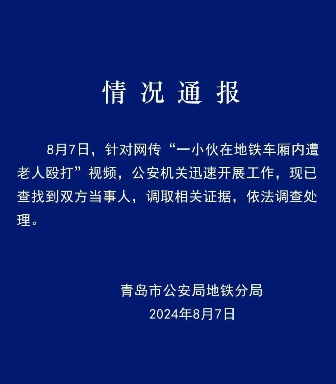 8月9日,微信公眾號“青島地鐵公安”再發(fā)通報詳述案情。通報稱,8月7日,和某城(男,23歲,無業(yè))乘坐地鐵期間對周圍多名乘客進(jìn)行言語滋擾,在對翟某緒(男,69歲,退休職工)進(jìn)行滋擾辱罵后,雙方發(fā)生肢體沖突,過程中和某城扯破翟某緒上衣,翟某緒擊打和某城面部。公安機關(guān)依法對和某城處以行政拘留處罰,翟某緒毆打和某城致其鼻骨粉碎性骨折,傷情損傷程度為輕傷二級,涉嫌故意傷害罪,依法對其采取刑事強制措施,案件正在進(jìn)一步辦理中。