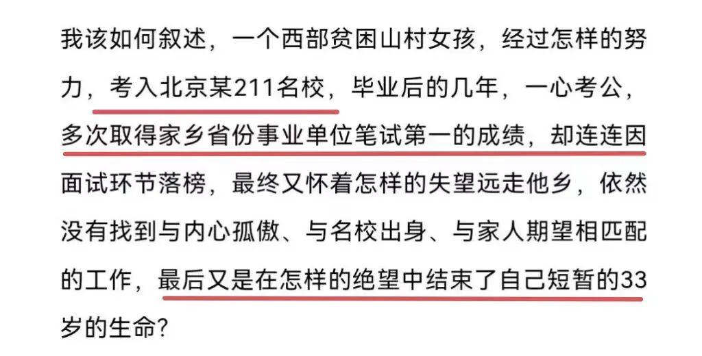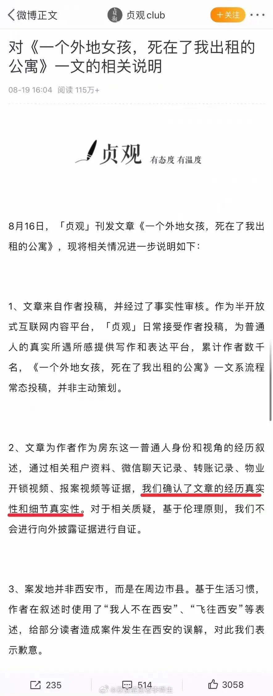 8月16日,微信公眾號“貞觀”發(fā)布一篇作者為“十二橡樹”的文章《一個(gè)外地女孩死在了我出租的公寓》。文章稱,今年4月,一名來自寧夏西海固山區(qū)的女孩租住了作者的單身公寓,她畢業(yè)于北京211高校,職業(yè)為會(huì)計(jì),當(dāng)時(shí)正在陜西西安找工作。女孩畢業(yè)后一心考公,多次取得家鄉(xiāng)省份事業(yè)單位筆試第一的成績,卻一次次在面試環(huán)節(jié)落榜。6月25日,有人發(fā)現(xiàn)女孩疑似餓死在出租屋內(nèi),警方已介入處理。8月18日,“貞觀”以保護(hù)當(dāng)事人為由刪除該文章,并回應(yīng)稱文中所述為真實(shí)事件。8月19日,“貞觀”再次回應(yīng)稱文章來自作者投稿,經(jīng)過事實(shí)性審核,但案發(fā)地并非西安市,而是在周邊市縣。相關(guān)文章在社交平臺(tái)上引起熱傳,輿論呈現(xiàn)兩極分化:部分網(wǎng)民表示震驚和悲涼,借此對社會(huì)表達(dá)不滿;部分網(wǎng)民則對文內(nèi)相關(guān)細(xì)節(jié)的真實(shí)性提出疑問。