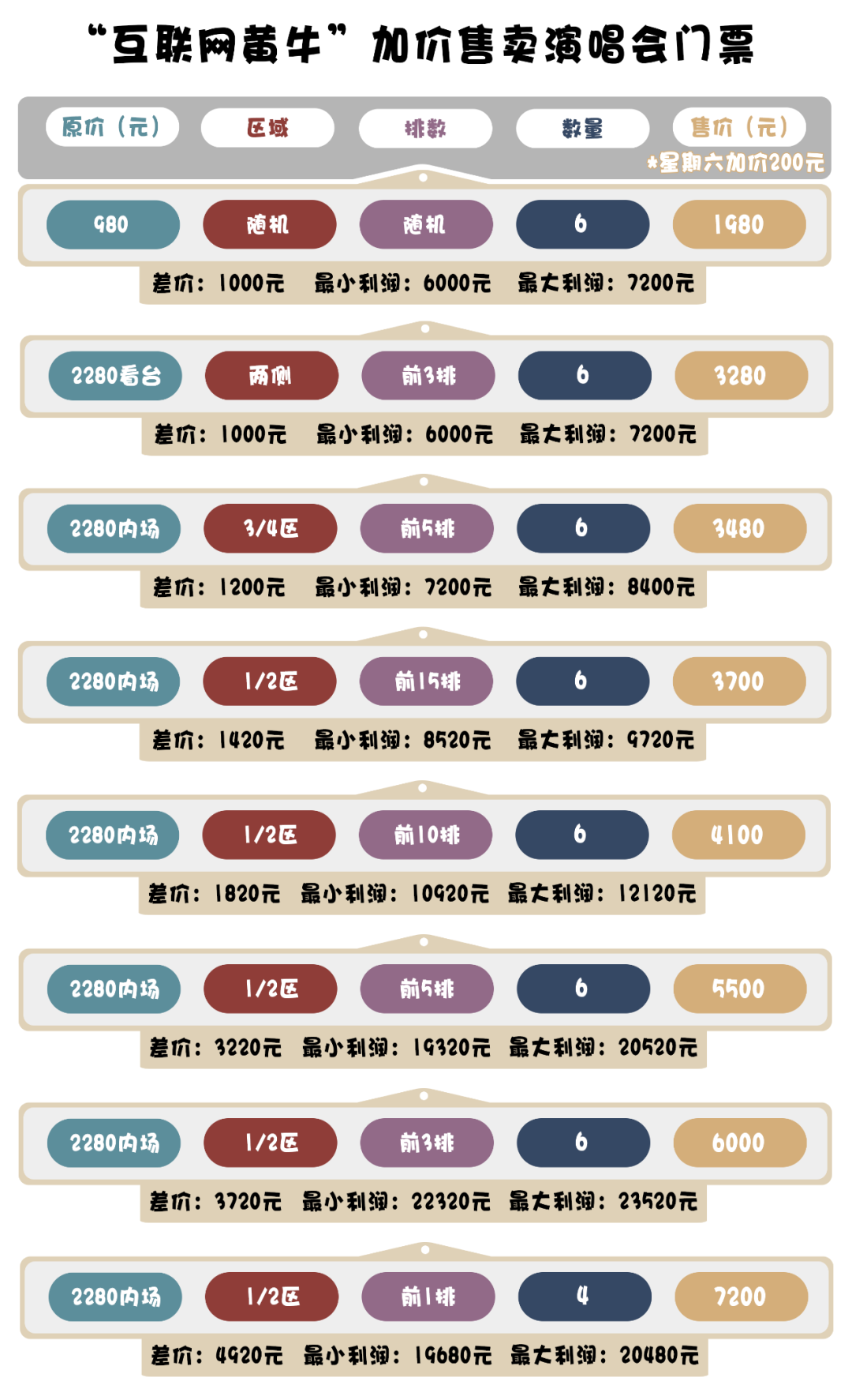 盡管如此,對(duì)于背后有二級(jí)資源的“互聯(lián)網(wǎng)黃?!眮碚f,售賣“黃?!逼辈⒉皇请y事。以某位在廣東地區(qū)深受歡迎的歌手為例,其預(yù)計(jì)在今年11月舉行多場(chǎng)個(gè)人演唱會(huì),但有粉絲表示,演唱會(huì)的門票仍“一秒售罄”。某二手置物平臺(tái)數(shù)據(jù)顯示,演唱會(huì)門票并非全部售空,部分門票流入“互聯(lián)網(wǎng)黃?!敝?,原價(jià)為2280元的內(nèi)場(chǎng)票,因位置不同被炒至3280元至7200元不等。此外,若趕上演唱會(huì)在星期六舉辦,買家還需要額外支付200元的“熱門時(shí)段搶票費(fèi)用”。面對(duì)“一人一證”的入場(chǎng)機(jī)制,“互聯(lián)網(wǎng)黃?!钡纳馑坪醪⑽词艿接绊憽?/span>