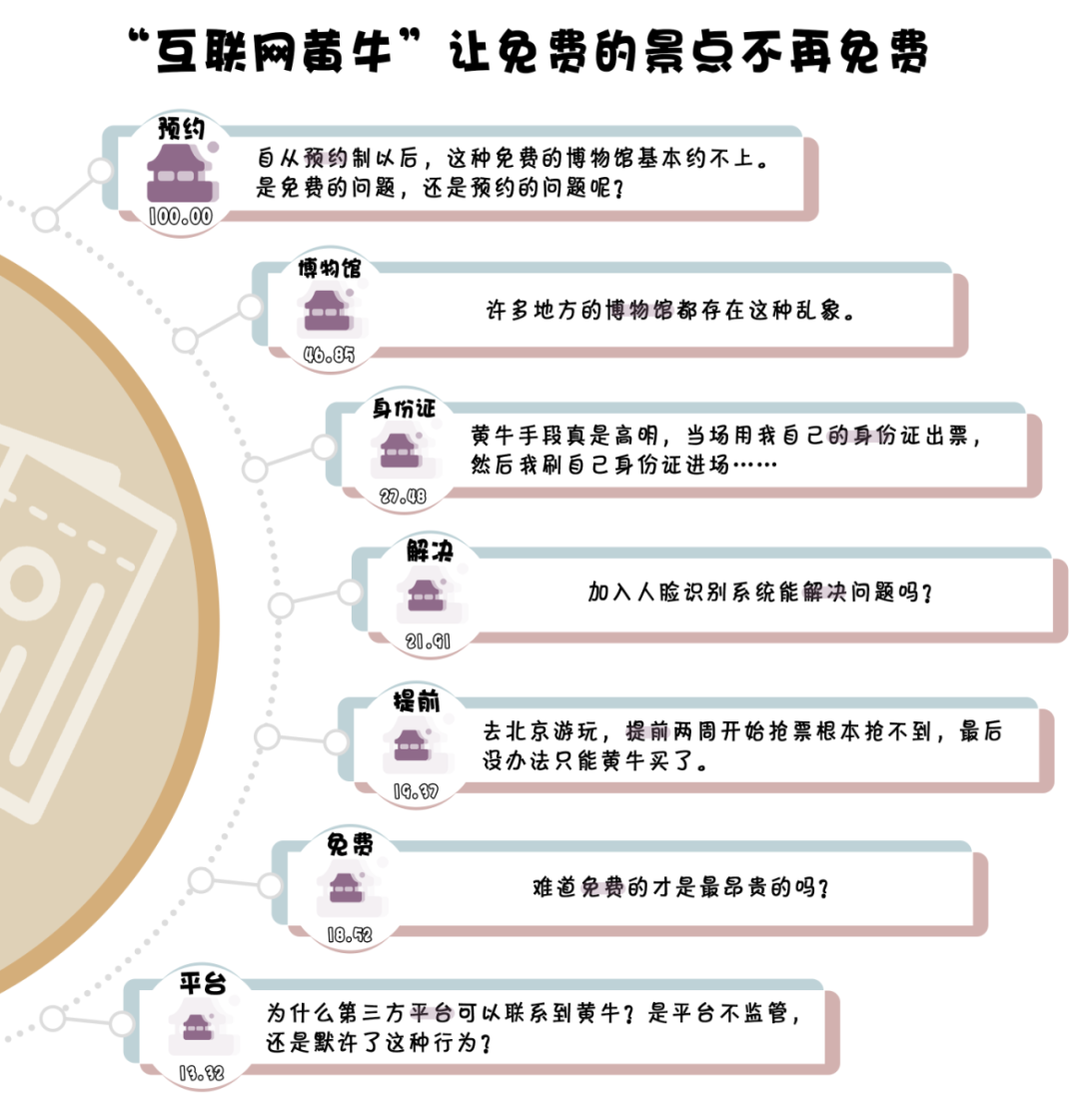 如此“作弊”手段引發(fā)輿論熱議。有網(wǎng)民表示,多地免費(fèi)景點(diǎn)都存在預(yù)約不上的現(xiàn)象,想去游玩必須花錢,其中博物館成“重災(zāi)區(qū)”;有網(wǎng)民感嘆“互聯(lián)網(wǎng)黃牛”手段之高明令人不得不服,其已經(jīng)默許了“互聯(lián)網(wǎng)黃牛”現(xiàn)象;部分網(wǎng)民反映,某些第三方平臺(tái)上,免費(fèi)預(yù)約門票被裹上“講解服務(wù)”“研學(xué)套餐”等外衣,搖身一變成為貨架上的商品,不禁令人發(fā)問,“互聯(lián)網(wǎng)黃牛”為何可以明目張膽地在第三方平臺(tái)上售賣免費(fèi)預(yù)約門票?是官方平臺(tái)監(jiān)管不力、置之不理,還是其授意“互聯(lián)網(wǎng)黃?!迸c第三方平臺(tái)相互串通謀取利益?