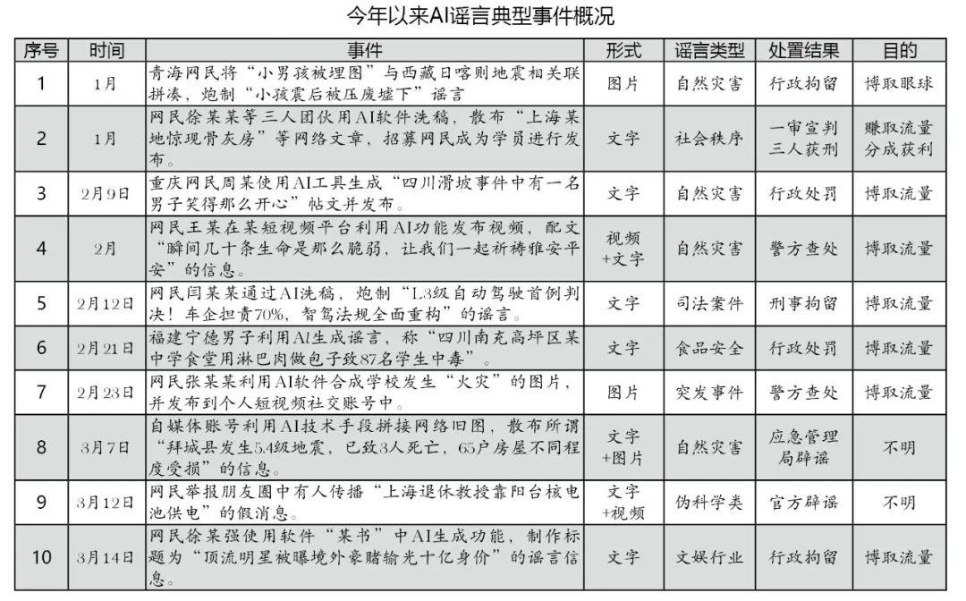10起典型案例中,有4起AI謠言與自然災(zāi)害相關(guān),包括地震、山體滑坡等;2起謠言涉及食品安全和突發(fā)事件,分別為“四川某中學(xué)食堂用淋巴肉做包子致87名學(xué)生中毒”和“某地學(xué)校發(fā)生火災(zāi)”;還有4起謠言分別涉及偽科學(xué)、文娛行業(yè)、社會(huì)秩序和司法案件四個(gè)方面。AI謠言表現(xiàn)形式較多,大多通過(guò)微博、微信、短視頻等社交媒體渠道擴(kuò)散,并以文字、圖片、視頻形式單一或“搭配”傳播,比如“西藏定日縣地震一小孩被壓廢墟”謠言形式為圖片,“上海退休教授靠陽(yáng)臺(tái)核電池供電”謠言則是以“文字+視頻”的形式傳播。造謠動(dòng)機(jī)方面,有8起事件明確提到造謠者是為了蹭熱點(diǎn)、賺取流量收益,可見(jiàn)流量經(jīng)濟(jì)仍然是AI謠言存在的底層邏輯。10起事件中,有2起事件被官方辟謠,但沒(méi)有其他情況通報(bào),其余8起均有明確處理結(jié)果。處置結(jié)果方面,10起事件中有5起事件的造謠者被公安機(jī)關(guān)給予行政處罰或行政拘留,有2起事件進(jìn)入到司法流程,網(wǎng)民閆某某因刻意炒作“國(guó)內(nèi)首例智能駕駛致死案”,被屬地警方刑事拘留;網(wǎng)民徐某某等3人散布“上海某地驚現(xiàn)骨灰房”等謠言,獲利數(shù)額較大,被上海當(dāng)?shù)胤ㄔ阂苑欠ń?jīng)營(yíng)罪判處有期徒刑一年十個(gè)月不等。