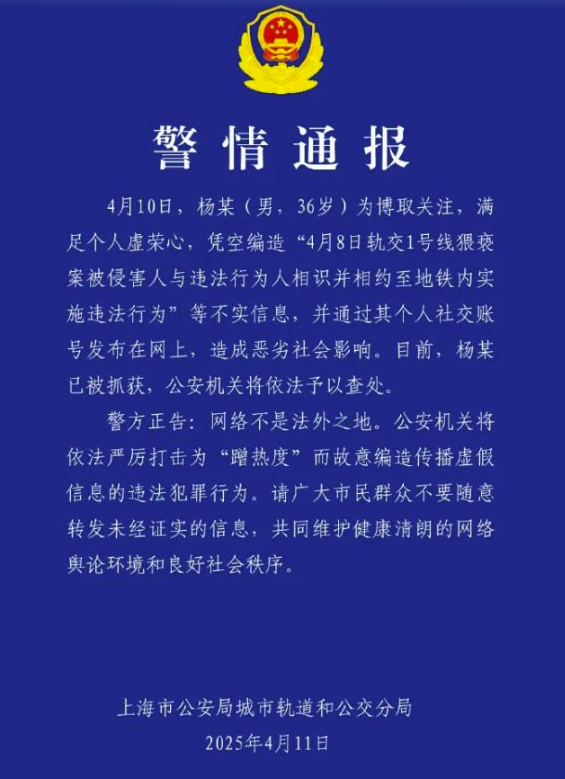 4月11日9時(shí)29分,“@軌交幺幺零”再發(fā)通報(bào)稱,男子楊某為博取關(guān)注,憑空編造“軌交1號(hào)線猥褻案男女雙方相識(shí)”謠言,發(fā)布到網(wǎng)上后造成惡劣影響,目前已被抓獲。官方通報(bào)再掀一波討論熱潮,微博轉(zhuǎn)評(píng)2萬余次、點(diǎn)贊超26萬次,“進(jìn)去得好”“還是官方速度快”等評(píng)論獲得網(wǎng)民點(diǎn)贊認(rèn)同。紅星新聞、極目新聞等媒體發(fā)文稱,“造黃謠和性騷擾都該人人喊打”;部分網(wǎng)民言論涉及性別對(duì)立話題,如“出手相助的是女的,猥褻造謠的都是男的”。截至4月17日12時(shí),該事件相關(guān)輿情信息量超8萬條,“#上海地鐵一男子疑脫褲猥褻女乘客#”“#上海辟謠地鐵猥褻事件當(dāng)事人相識(shí)#”等數(shù)十個(gè)關(guān)聯(lián)微話題累計(jì)閱讀量超6億。