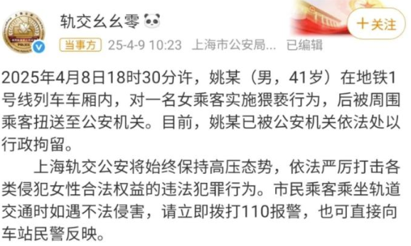 4月9日上午,多段網(wǎng)傳視頻引發(fā)關(guān)注,視頻顯示,上海地鐵一名女乘客疑似被猥褻,對(duì)身邊男子哭喊道“你把褲子脫了并弄到我身上”,同車女子稱“姐妹,我錄了視頻,我陪你去”?!癅荔枝新聞”等媒體跟進(jìn)報(bào)道,上海地鐵客服工作人員稱確有其事,網(wǎng)民痛斥男子“變態(tài)”“垃圾”。當(dāng)日10時(shí)23分,上海市公安局城市軌道和公交分局官微“@軌交幺幺零”發(fā)通報(bào)稱,“4月8日18時(shí)30分許,姚某在地鐵1號(hào)線列車車廂內(nèi),對(duì)一名女乘客實(shí)施猥褻行為,被周圍乘客扭送至公安機(jī)關(guān)。目前,姚某已被公安機(jī)關(guān)依法處以行政拘留”。多數(shù)網(wǎng)民稱贊警方行動(dòng)快速;部分網(wǎng)民表示不滿,認(rèn)為行政拘留處罰較輕。4月10日,男子所在的工作單位發(fā)布公告,宣布將其開除。