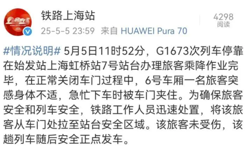 5月5日,網(wǎng)傳上海虹橋高鐵站又現(xiàn)“女子阻礙高鐵關(guān)門”事件。視頻顯示,有目擊者稱,女子此舉是為了等后面的老太太。當(dāng)日深夜,“@鐵路上海站”通報(bào)稱,當(dāng)事旅客因突感身體不適,急忙下車時(shí)被門夾住,工作人員迅速將其拉至安全區(qū)域。該旅客未受傷,該趟列車隨后安全正點(diǎn)發(fā)車。通報(bào)發(fā)出后,多數(shù)網(wǎng)民表示理解,但也有網(wǎng)民并不認(rèn)同上海鐵路方的處理方式,認(rèn)為如果以后都可以用這些理由,會引發(fā)更多人效仿。