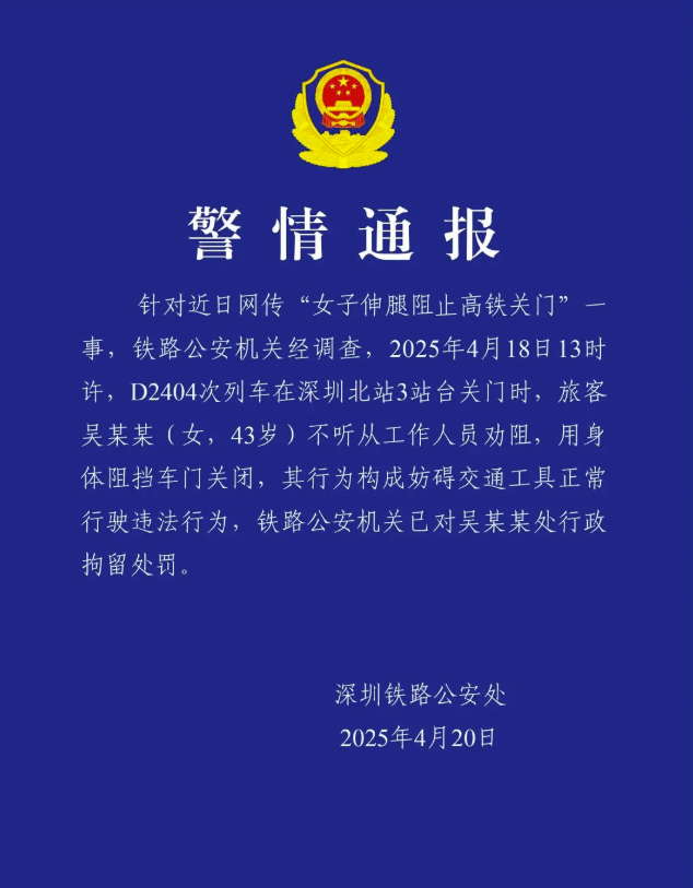 4月18日,一段“女子伸腿阻止高鐵關(guān)門”的視頻在網(wǎng)絡(luò)上引起熱議。視頻中,一名女性旅客強(qiáng)行用身體阻攔車門,兩名工作人員極力制止卻未能成功,直到三名同行人上車才離開車門,隨后列車關(guān)門駛離。4月19日,“@廣鐵集團(tuán)深圳北火車站”發(fā)布情況說明,證實(shí)網(wǎng)傳視頻屬實(shí),并稱未造成列車晚點(diǎn),相關(guān)部門已介入調(diào)查。輿論要求嚴(yán)懲行為人呼聲較高,部分網(wǎng)民不滿工作人員制止不力,對相關(guān)法律規(guī)章制度未嚴(yán)格執(zhí)行。4月20日,深圳鐵路公安處官方微博通報(bào)稱,旅客吳某某行為構(gòu)成妨礙交通工具正常行駛違法行為,已被行政拘留。主流輿論點(diǎn)贊警方處置及時(shí),并圍繞“攔門事件何時(shí)休”展開討論。如中國網(wǎng)發(fā)文建議,修訂《鐵路安全管理?xiàng)l例》,明確阻礙發(fā)車的量化處罰標(biāo)準(zhǔn),如按延誤時(shí)長階梯式罰款。上觀新聞、紅網(wǎng)發(fā)文稱,鐵路部門應(yīng)加大處罰力度,將“危害安全行為”納入個(gè)人征信系統(tǒng)、列入限行“黑名單”,形成更強(qiáng)的震懾效應(yīng)。