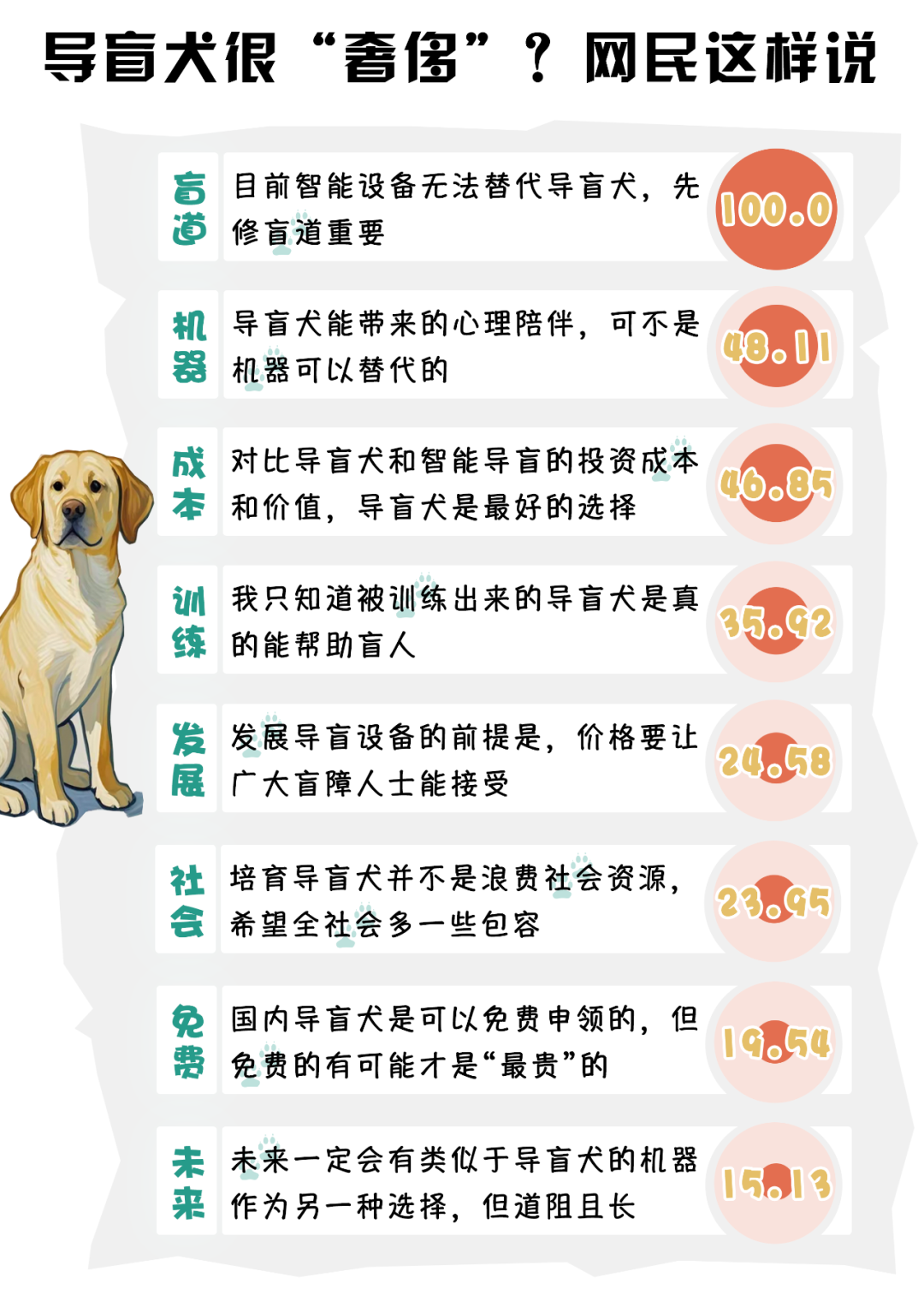 數(shù)據(jù)顯示,培訓(xùn)一條導(dǎo)盲犬的成本約20萬(wàn)元,有人戲稱其是“奢侈品”。其實(shí),導(dǎo)盲犬是免費(fèi)給視障人士使用的,其養(yǎng)護(hù)、醫(yī)療等成本與寵物犬相差并不大。輿論場(chǎng)中,網(wǎng)民對(duì)于導(dǎo)盲犬的價(jià)值討論呈現(xiàn)截然不同看法。
