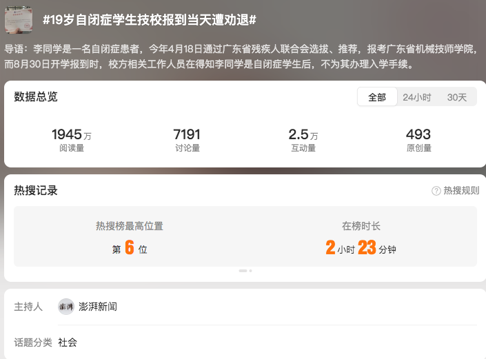 9月9日,澎湃新聞采訪相關(guān)方首發(fā)報(bào)道,當(dāng)事同學(xué)父親認(rèn)為,校方的審核、錄取程序存在諸多疏漏,直至入學(xué)報(bào)到當(dāng)天才說(shuō)不予接收,讓學(xué)生錯(cuò)失了報(bào)讀其他學(xué)校的機(jī)會(huì)。廣東省機(jī)械技師學(xué)院宣傳部相關(guān)負(fù)責(zé)人回應(yīng)稱,學(xué)校確實(shí)向該同學(xué)發(fā)放錄取通知書(shū),但該殘疾人招生項(xiàng)目主要面向肢體殘疾和言語(yǔ)殘疾學(xué)生,面試時(shí)校方教師對(duì)該同學(xué)患有自閉癥并不知情。因擔(dān)心對(duì)學(xué)校正常學(xué)生造成影響,建議其找其他合適的學(xué)校就讀。該報(bào)道發(fā)布后,齊魯晚報(bào)、上游新聞、極目新聞等媒體跟進(jìn)轉(zhuǎn)載,輿情開(kāi)始發(fā)酵,#19歲自閉癥學(xué)生技校報(bào)到當(dāng)天遭勸退#微博話題登上熱搜榜第6位。