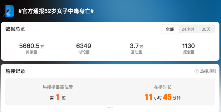 9月15日,浙江省杭州市余杭區(qū)閑林街道辦事處發(fā)布情況通報稱,9月9日,涂某某(女,52歲)在進入閑林中路附近空地時,不慎接觸廢棄氫氟酸中毒,送醫(yī)后經(jīng)搶救無效于2025年9月14日凌晨不幸身亡。公安機關(guān)在接警后第一時間介入調(diào)查;生態(tài)環(huán)境部門已按規(guī)范完成現(xiàn)場無害化處置;街道正在全力推進善后處置工作。目前,事發(fā)原因正在進一步調(diào)查中。當晚“官方通報52歲女子中毒身亡”登上熱搜榜第一位,閱讀量迅速破千萬。