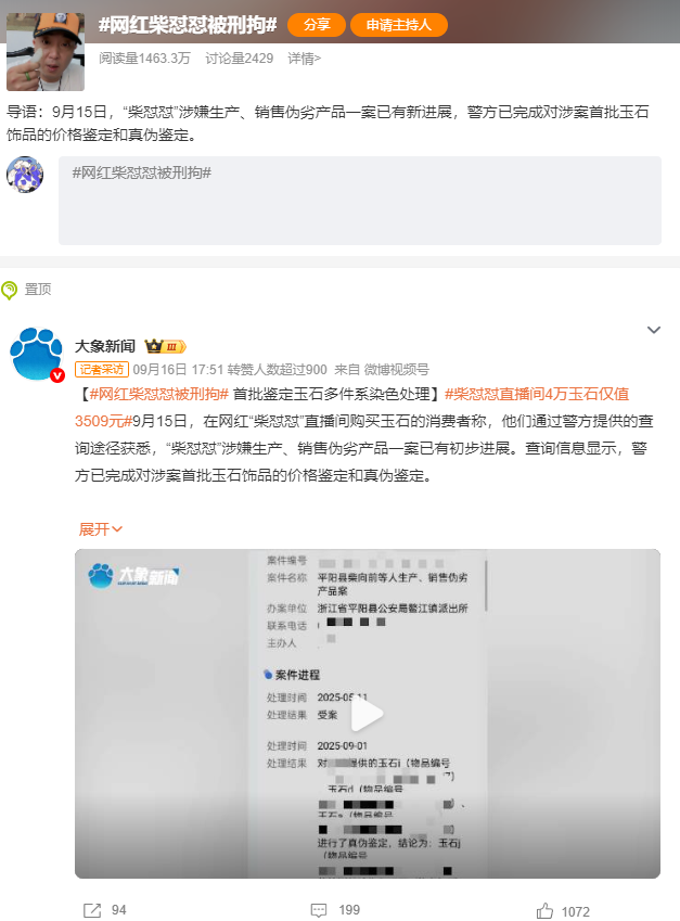 “柴懟懟”時隔半年再度登上熱搜榜單,不同的是,其4月以“打假斗士”的形象聲稱胖東來“玉石假冒偽劣”,9月卻因“涉嫌生產(chǎn)、銷售偽劣產(chǎn)品罪”被警方刑拘。這場“賊喊捉賊”的戲碼最終落下帷幕。強烈的“戲劇沖突”引發(fā)大量網(wǎng)民關(guān)注,推動輿情升溫。公眾的關(guān)注焦點也逐漸從柴懟懟個人行徑,延伸至網(wǎng)絡(luò)造謠成本、直播亂象及監(jiān)管整治等層面。