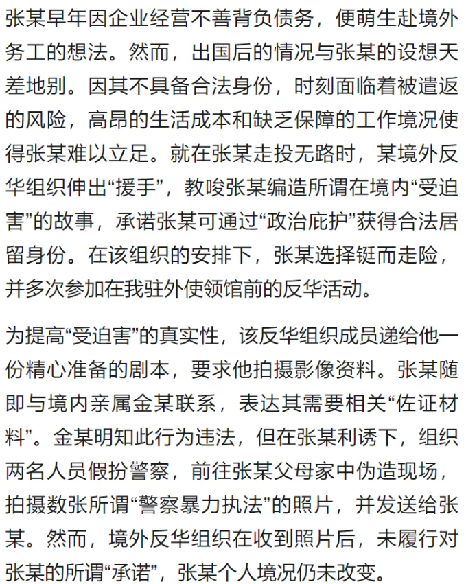 4. “境外反華組織教唆擺拍暴力執(zhí)法” 案。8月14日,國(guó)家安全部公布一起標(biāo)題為《跨境賣(mài)慘終成空》的案例。據(jù)悉,張某國(guó)內(nèi)企業(yè)經(jīng)營(yíng)不善負(fù)債,赴境外務(wù)工后因無(wú)合法身份面臨遣返風(fēng)險(xiǎn)。境外反華組織以“政治庇護(hù)換取居留身份”為誘餌,提供詳細(xì)拍攝劇本,還提出“畫(huà)面暴力血腥”“效果要慘”“抓拍增強(qiáng)真實(shí)感”等要求。在反華組織教唆下,張某聯(lián)系到親屬金某,金某明知此行為違法,但在張某利誘下組織兩名人員假扮警察,前往張某父母家中偽造現(xiàn)場(chǎng),拍攝數(shù)張所謂“警察暴力執(zhí)法”的照片,并將材料發(fā)送境外,但境外反華組織在收到照片后未履行對(duì)張某的所謂“承諾”。該案最終被國(guó)家安全機(jī)關(guān)破獲。央視網(wǎng)、微信公眾號(hào)“俠客島”等轉(zhuǎn)發(fā)相關(guān)內(nèi)容。輿論將此案稱(chēng)為一場(chǎng)“政治避難”鬧劇,指出“因一己之利參加境外反華活動(dòng),為反華勢(shì)力提供煽宣‘彈藥’,但最終竹籃打水一場(chǎng)空”。