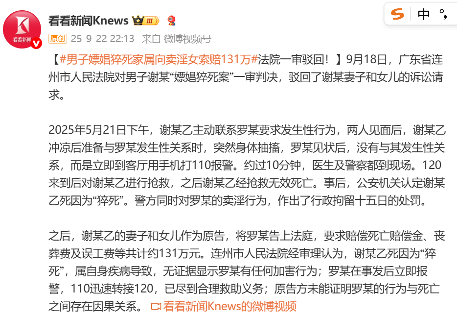 9月22日,據(jù)上海電視臺“@看看新聞Knews”消息,9月18日,廣東省連州市人民法院對男子謝某“嫖娼猝死案”作出一審判決。裁判文書網(wǎng)顯示,5月21日,謝某主動聯(lián)系羅某要求發(fā)生性行為,兩人見面后,謝某沖涼后準(zhǔn)備發(fā)生性關(guān)系時突然身體抽搐,羅某見狀后,立即到客廳撥打110報警。醫(yī)護人員趕到后對謝某進行搶救,謝某經(jīng)搶救無效死亡。警方認(rèn)定謝某死因為“猝死”,對羅某的賣淫行為,作出行政拘留十五日的處罰。事后,謝某的妻子和女兒將羅某告上法庭,要求賠償死亡賠償金、喪葬費及誤工費等共計約131萬元。連州市人民法院經(jīng)審理認(rèn)為,謝某死因為“猝死”,屬自身疾病導(dǎo)致,無證據(jù)顯示羅某有任何加害行為;羅某在事發(fā)后當(dāng)即報警并配合120搶救,已盡到合理救助義務(wù);原告方未能證明羅某的行為與死亡之間存在因果關(guān)系。據(jù)此,該法院駁回謝某妻子和女兒的全部訴訟請求。