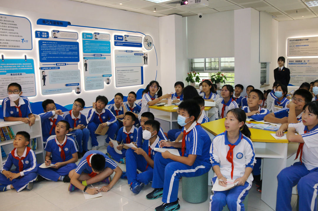 活動中,檢察人員帶領(lǐng)同學(xué)們先后參觀了憲法墻、未成年人檢察辦案工作室、心理咨詢室、家庭教育指導(dǎo)工作站等區(qū)域,接受法治文化熏陶。在法治教育基地,檢察人員通過具體案例,以互動教學(xué)的形式為同學(xué)們講解校園欺凌、毒品犯罪以及未成年人保護(hù)法等內(nèi)容,引導(dǎo)同學(xué)們警惕、抵制不良風(fēng)氣和違法犯罪行為,提高自我保護(hù)能力。