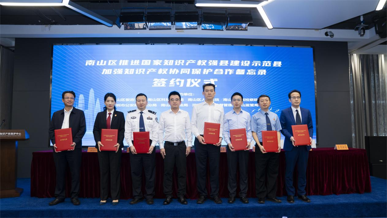 簽約儀式上,南山區(qū)委政法委、南山區(qū)科技創(chuàng)新局、南山區(qū)人民法院、南山區(qū)人民檢察院、南山區(qū)公安分局、南山區(qū)司法局、深圳市市場監(jiān)督管理局南山監(jiān)管局等7家單位共同簽約了《推進(jìn)國家知識產(chǎn)權(quán)強縣建設(shè)示范縣 加強知識產(chǎn)權(quán)協(xié)同保護(hù)合作備忘錄》(以下簡稱《合作備忘錄》)。