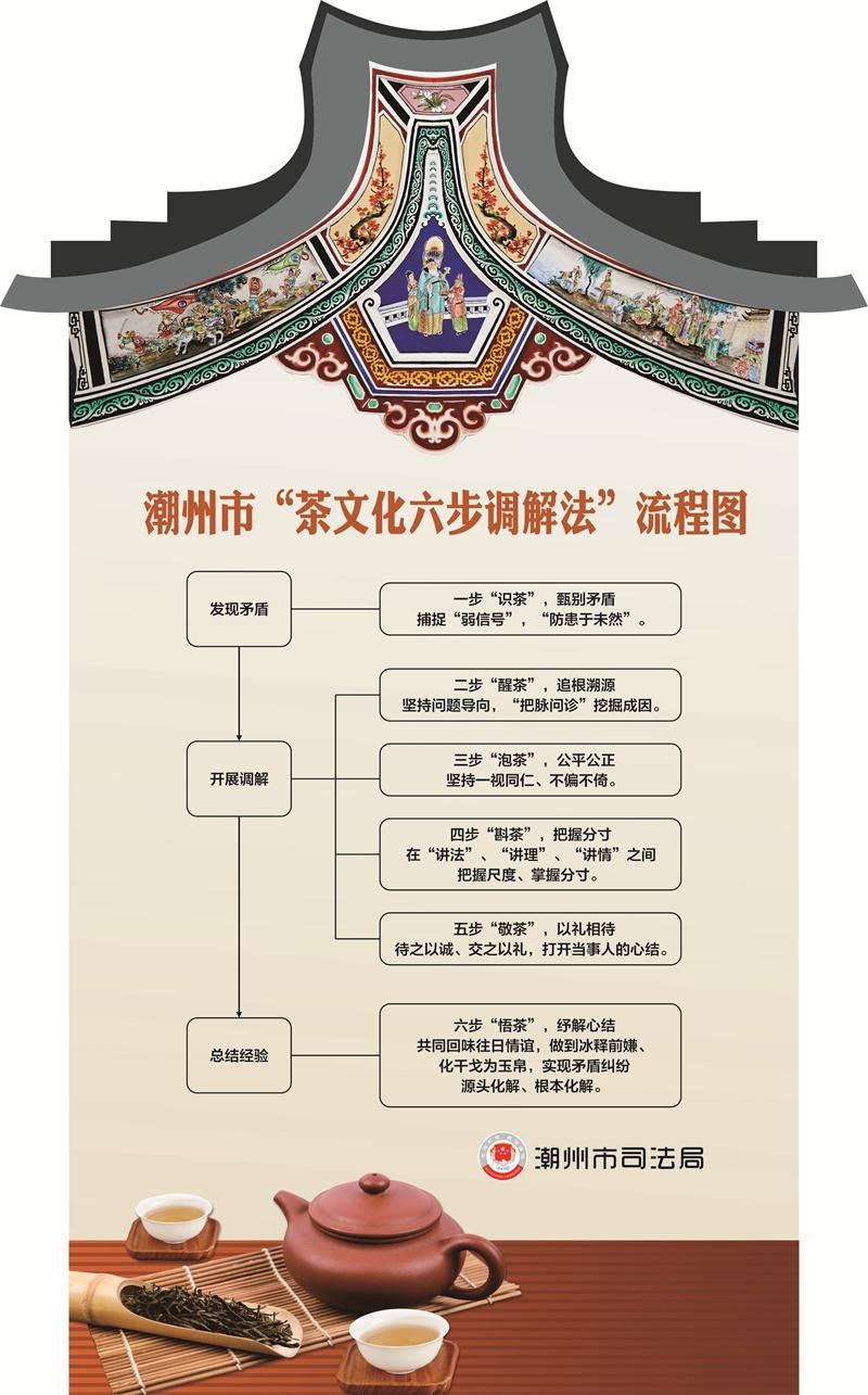 品一杯清茶,解雙方心結(jié)。據(jù)悉,近年來(lái),潮州市堅(jiān)持發(fā)展新時(shí)代廣東“楓橋經(jīng)驗(yàn)”,以潮州工夫茶“和、敬、精、樂(lè)”的文化精髓為基礎(chǔ),將“工夫茶二十一式”泡茶步驟與調(diào)解相結(jié)合,創(chuàng)設(shè)特色鮮明的“茶文化六步調(diào)解法”,打造了具有潮州特色的文化調(diào)解品牌。