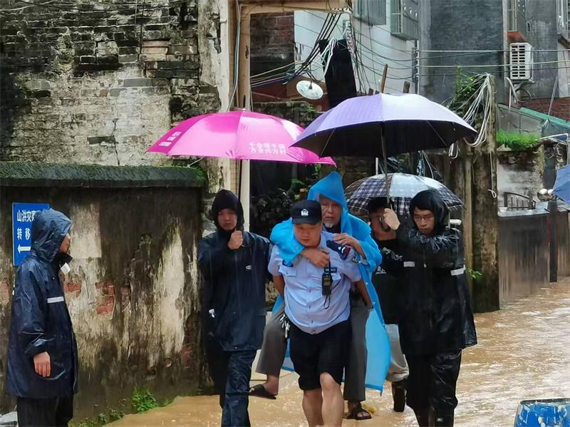6月16日下午,懷集縣公安局鳳崗派出所與鎮(zhèn)政府工作人員在鳳崗舊圩冒雨轉移受災群眾。李明烘 攝