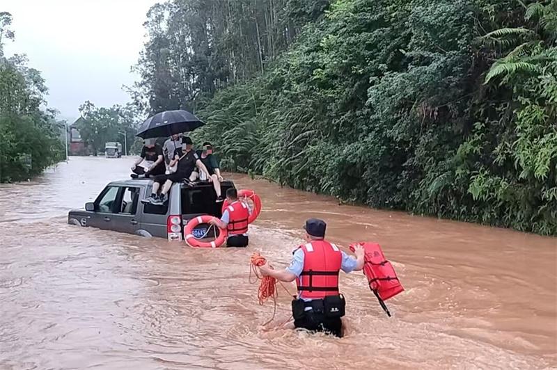 6月17日下午,懷集公安接到群眾緊急求助,稱中洲鎮(zhèn)泰西村路段有5人被困在兩輛車的車頂。轄區(qū)派出所民警接報后迅速驅車趕赴現(xiàn)場,蹚過齊腰深的洪水靠近被困車輛,成功將5名被困人員全部救出。