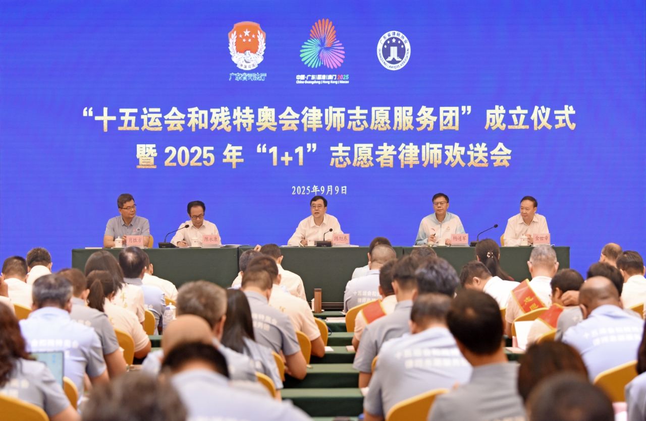為全力保障“十五運會和殘?zhí)貖W會”順利舉辦,廣東省律師協(xié)會積極響應(yīng)省委、省政府“當(dāng)好東道主”的號召,于9月9日在廣州正式成立“十五運會和殘?zhí)貖W會律師志愿服務(wù)團”,并舉行2025年“1+1”志愿者律師歡送會。廣東省司法廳黨委書記、廳長陳旭東出席儀式并講話,省司法廳黨委委員、副廳長陳永康主持活動。