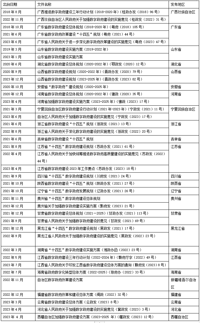 隨著國家層面指導(dǎo)文件以及各地數(shù)字政府建設(shè)發(fā)展規(guī)劃和實施方案等專項文件的陸續(xù)出臺,各地數(shù)字政府建設(shè)組織運行模式也呈現(xiàn)出一定共性。在組織領(lǐng)導(dǎo)建設(shè)方面,多地成立以?。ㄊ校┱嚓P(guān)負責同志為組長的數(shù)字政府建設(shè)領(lǐng)導(dǎo)小組,據(jù)統(tǒng)計,截至2023年8月,我國已有19個省級行政單位成立了數(shù)字政府建設(shè)領(lǐng)導(dǎo)小組,全面統(tǒng)籌推進數(shù)字政府重點任務(wù)的縱橫協(xié)調(diào)和督促落實。截至2023 年9月,我國已有26個省份發(fā)布38項數(shù)字政府建設(shè)指導(dǎo)文件。“十四五”以來我國數(shù)字政府業(yè)務(wù)場景建設(shè)項目達2.8萬個,數(shù)字政府承建企業(yè)超過24萬家。這標志著各地在數(shù)字政府建設(shè)頂層設(shè)計、運行體制等方面已經(jīng)初步完成相對系統(tǒng)的基礎(chǔ)制度建設(shè)。